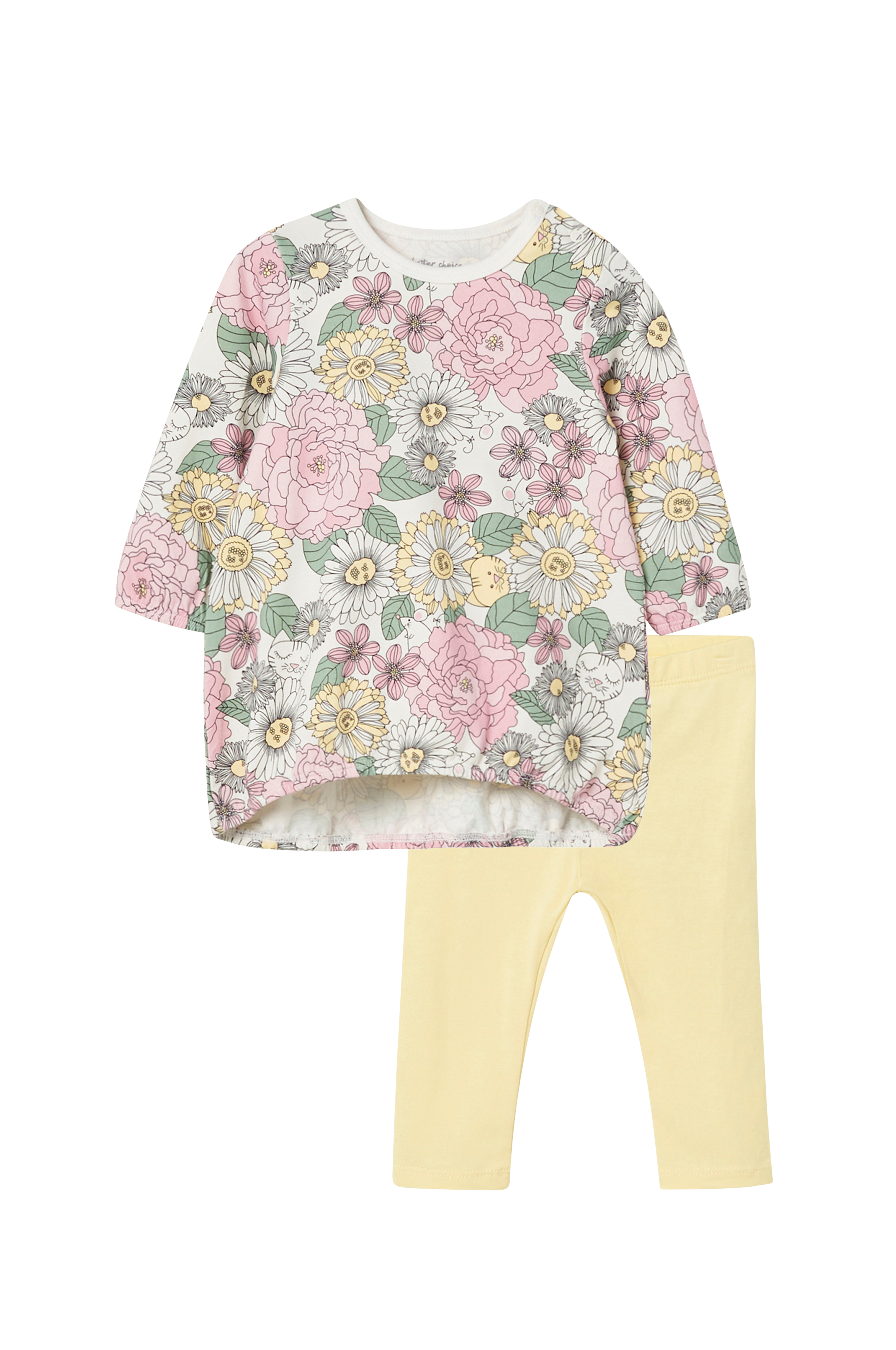 • Langærmet kjole med elastisk søm • Leggings med elastisk talje • Produktet indeholder økologisk bomuld, som er dyrket uden kemiske sprøjtemidler, kunstgødning og genmodificerede afgrøder (GMO). Dette betyder et sundere arbejdsmiljø for landmænd og bedre jord.