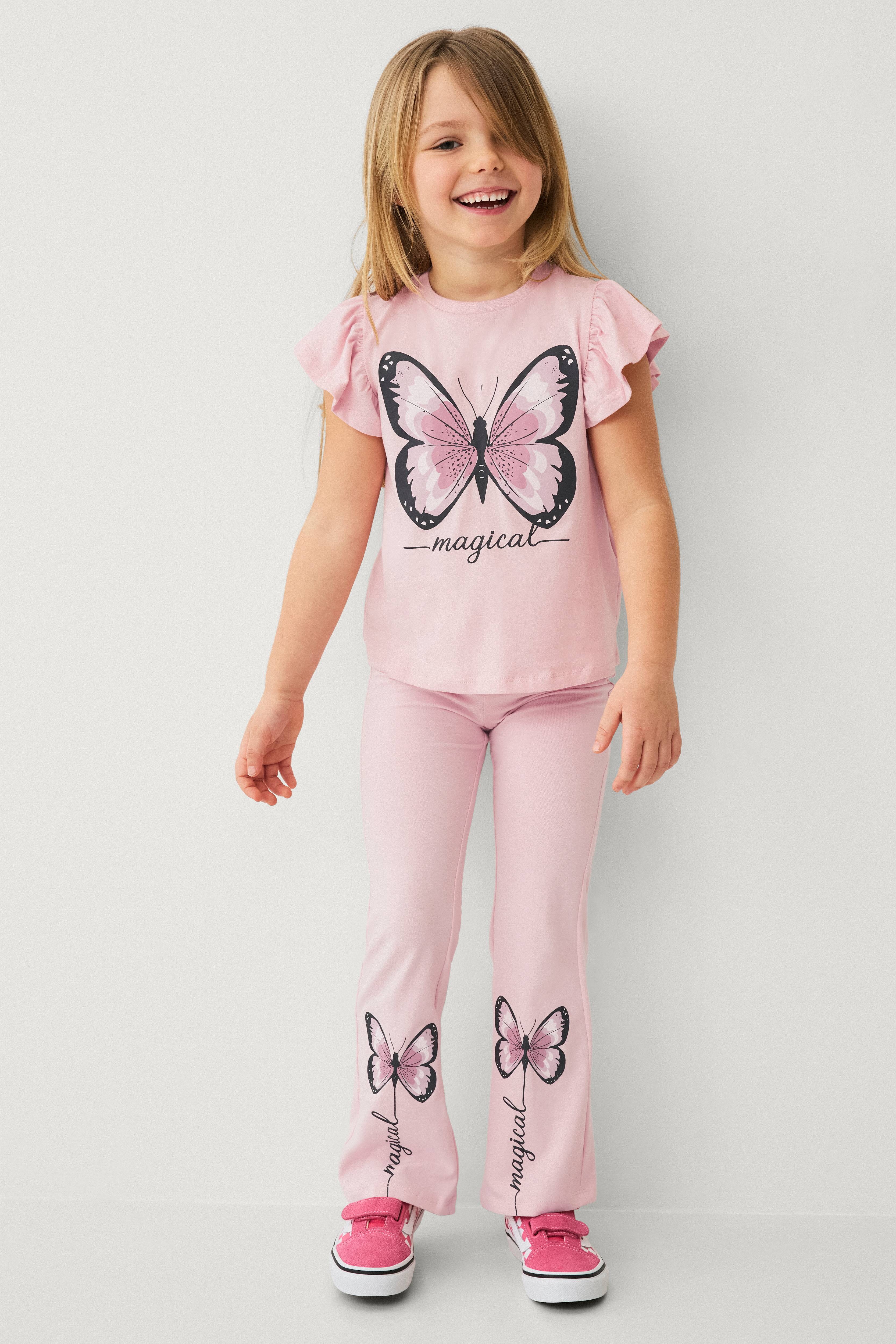 • 2-delt sæt i blød bomuldsjersey• Top med korte flagrende ærmer• Rund halsudskæring• Tryk foran• Leggings med ben med svaj• Tryk nederst på benene