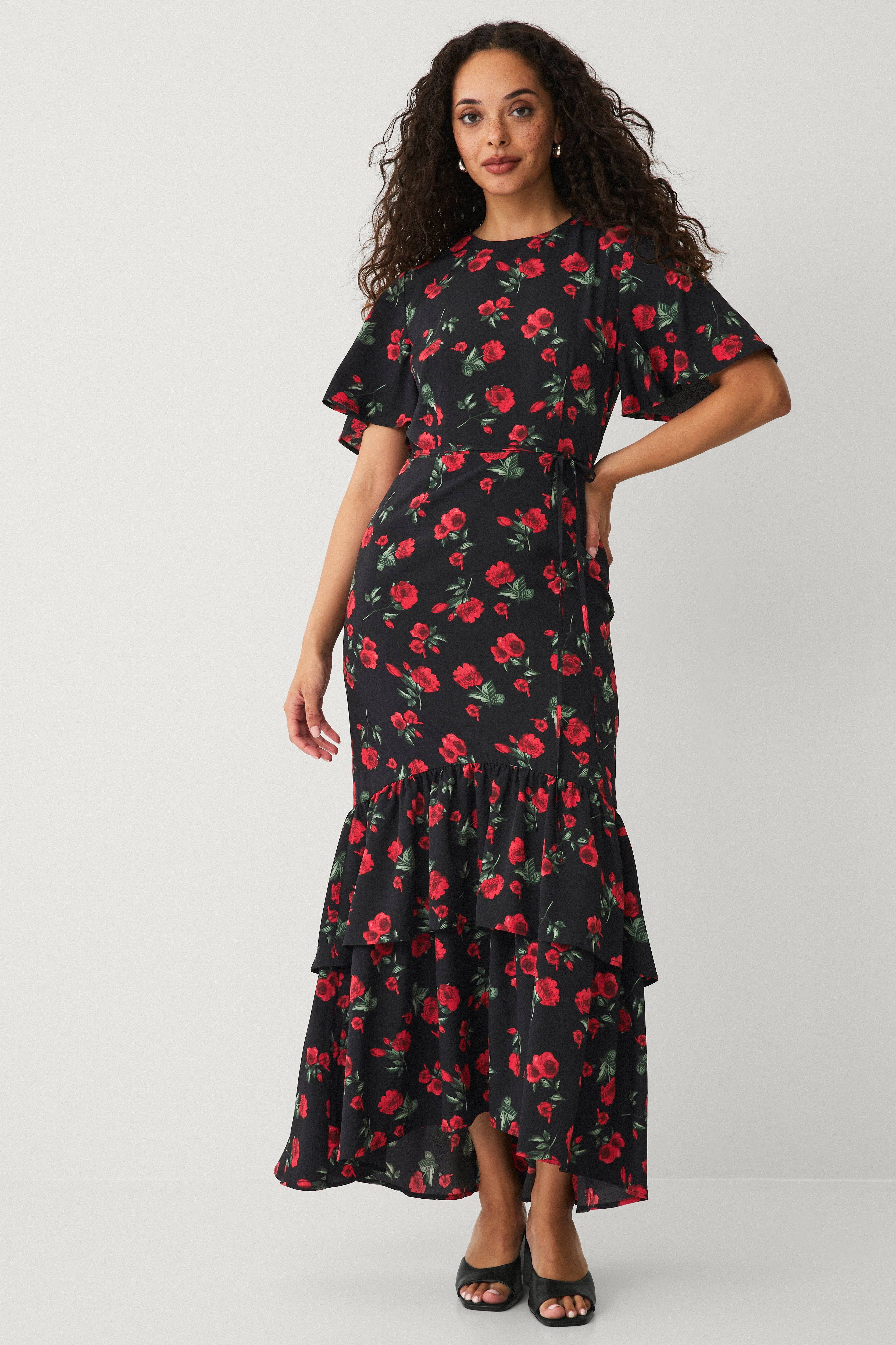 • Lang model med svaj• Rund hals med knap i nakken• Kort, bredt ærme• Defineret talje med tyndt bindebælte• Brede volanter• Længde: 135 cm i størrelse 36