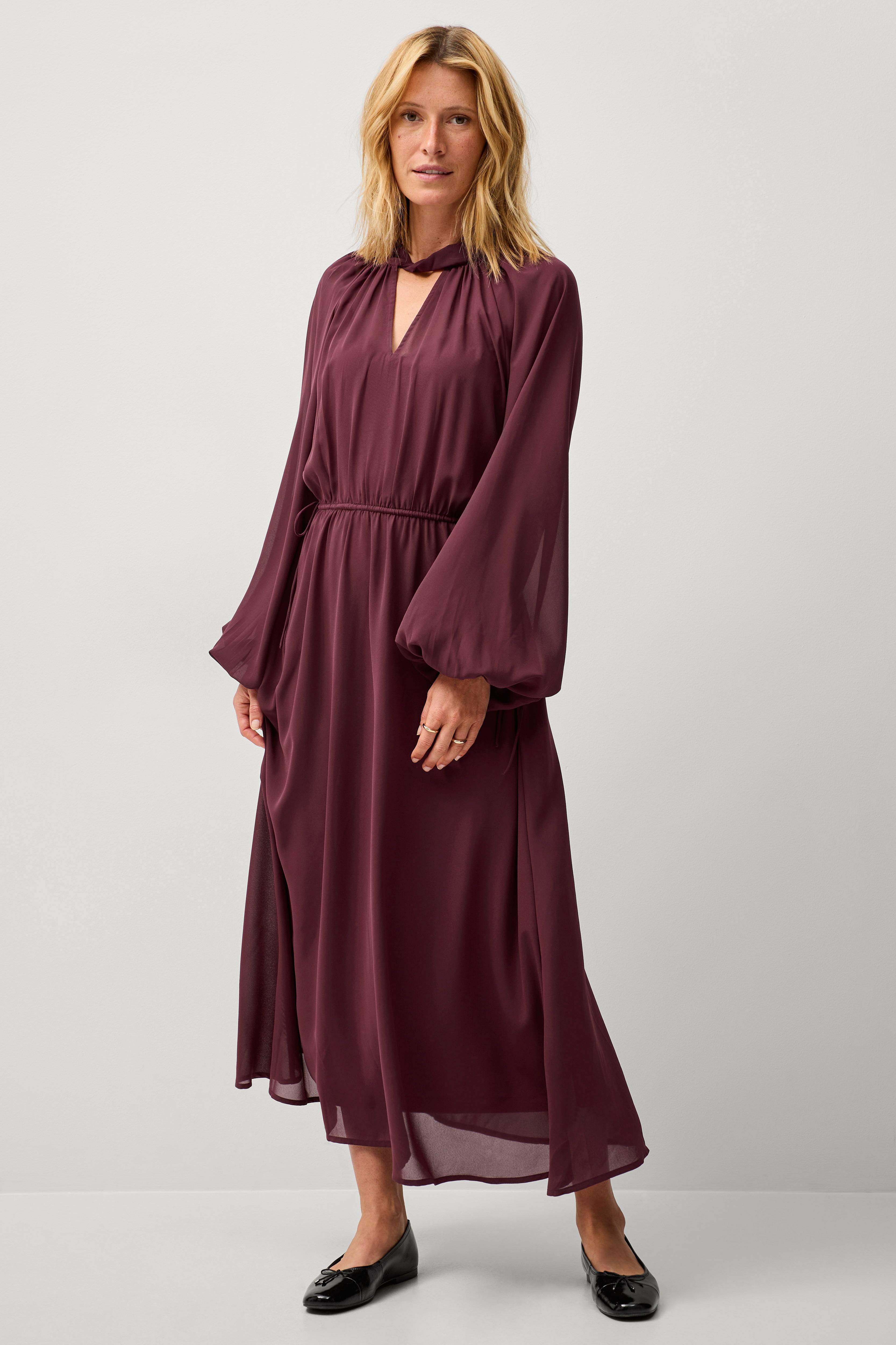 • Kjole i chiffon• Åbning i halsen og i nakken• Ballonærmer• Elastisk talje med træksnørre i siderne• Underkjole i jersey• Længde: 138 cm i størrelse S