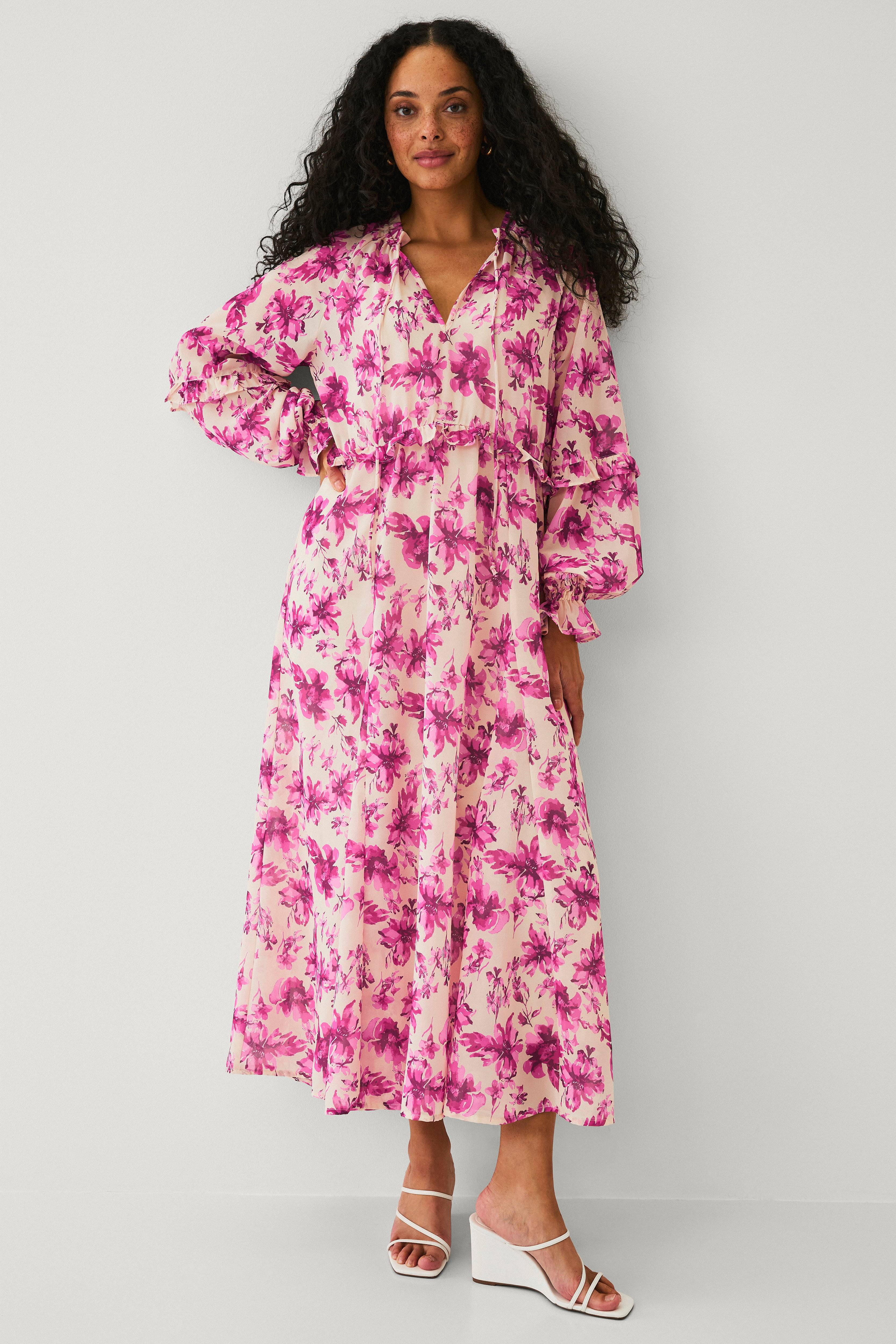• Mønstret maxi kjole i chiffon • Bred pasform • V-formet halsudskæring med bindebånd • Små flæsekanter rundt om halsen • Små flæsekanter omkring ærmerne og omkring taljen • Elastisk for med justérbare skulderstropper • Længde: 132 cm i størrelse S