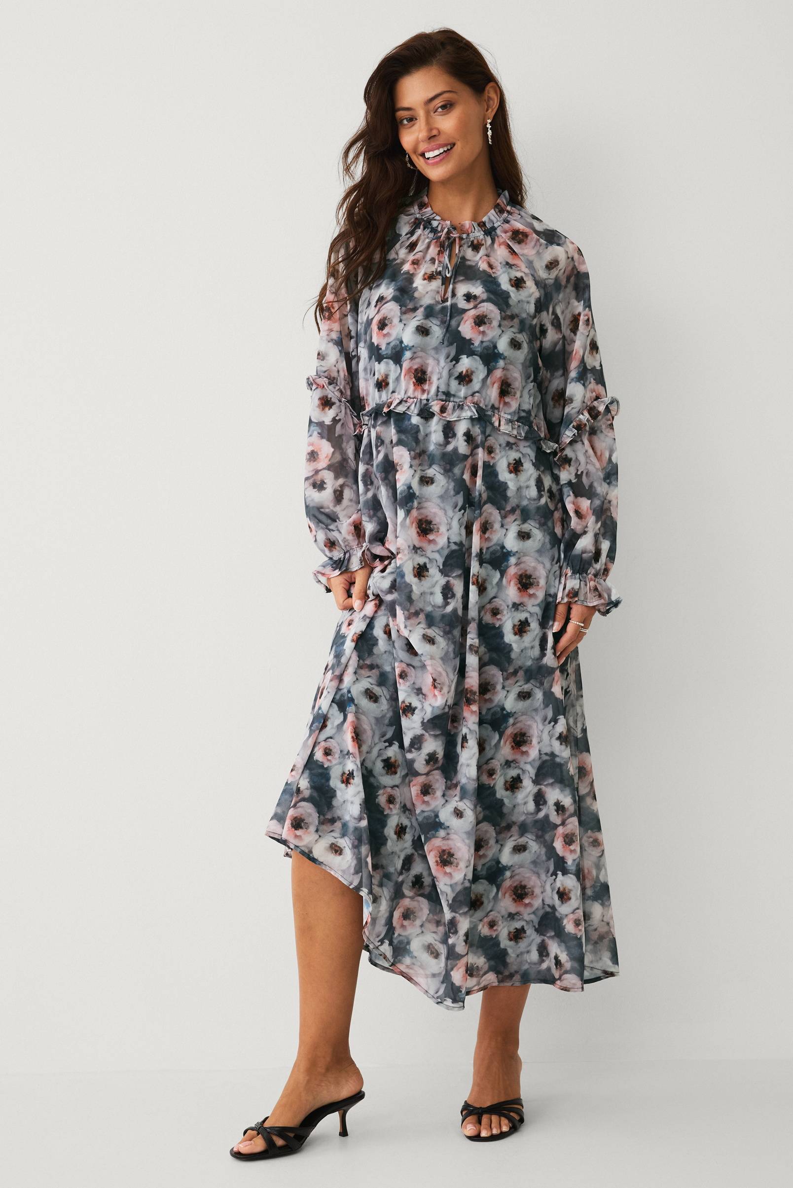 • Mønstret maxi kjole i chiffon • Bred pasform med nederdel med svaj • V-formet halsudskæring med bindebånd • Lille flæsekant rundt om halsen • Små flæsekanter omkring ærmerne og omkring taljen • Elastisk for med justérbare skulderstropper • Længde: 132 cm i størrelse S
