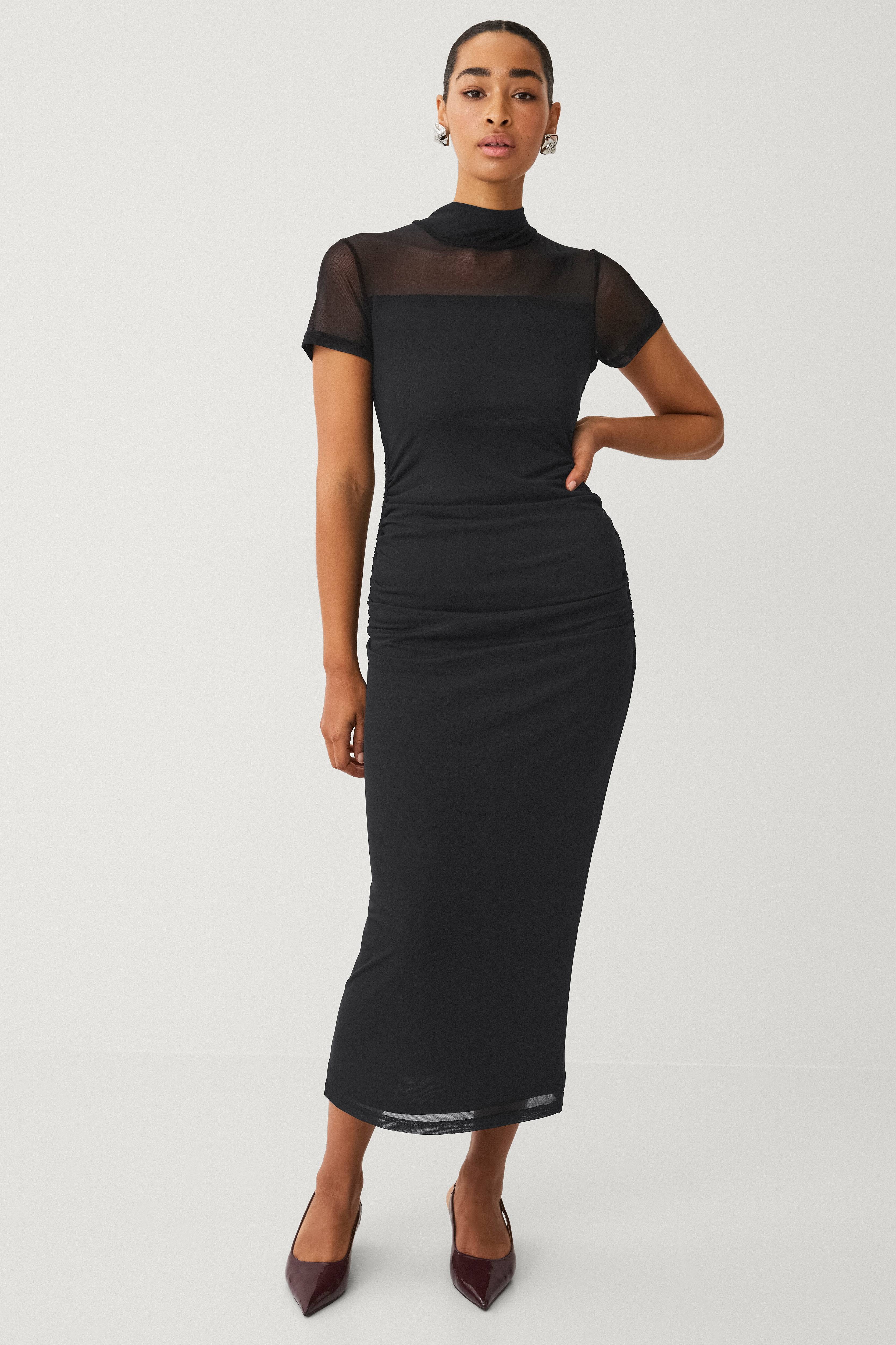 • Figurformede model i mesh• Elastiske draperinger i siderne og midt bagpå• Halvhøj krave med lynlås i ryggen• Kort ærme• Foret• Længde: 132 cm i størrelse S
