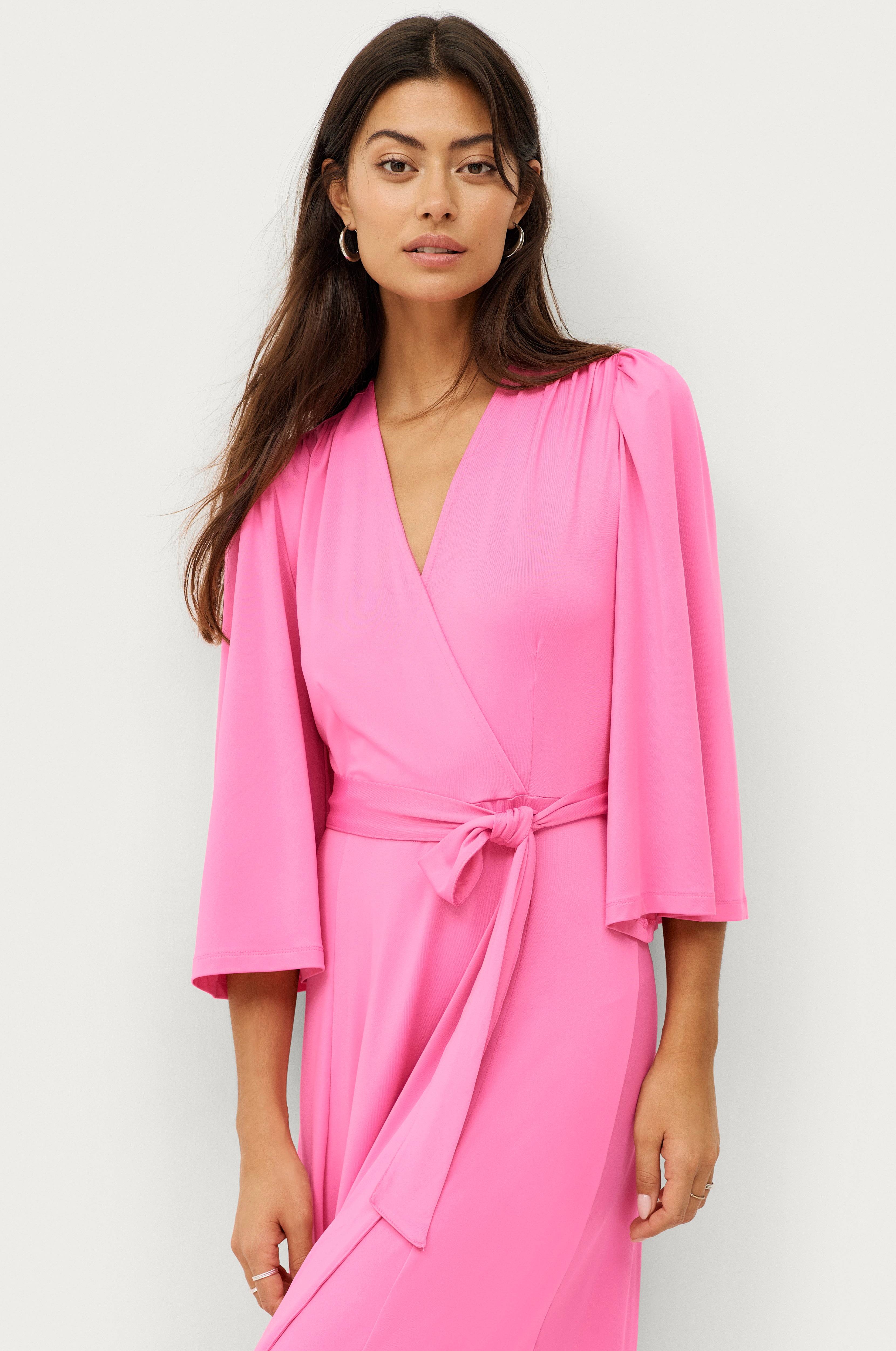 • Model med svaj med bindebælte ved taljen • V-udskæring med slå-om • 3/4 lange ærmer med svaj • Samling på skuldrene • Længde: 138 cm i størrelse 34/36 • Produktet indeholder genindvundet materiale, som genbruges for at reducere mængden af affald samtidigt med at der ikke anvendes nye ressourcer.