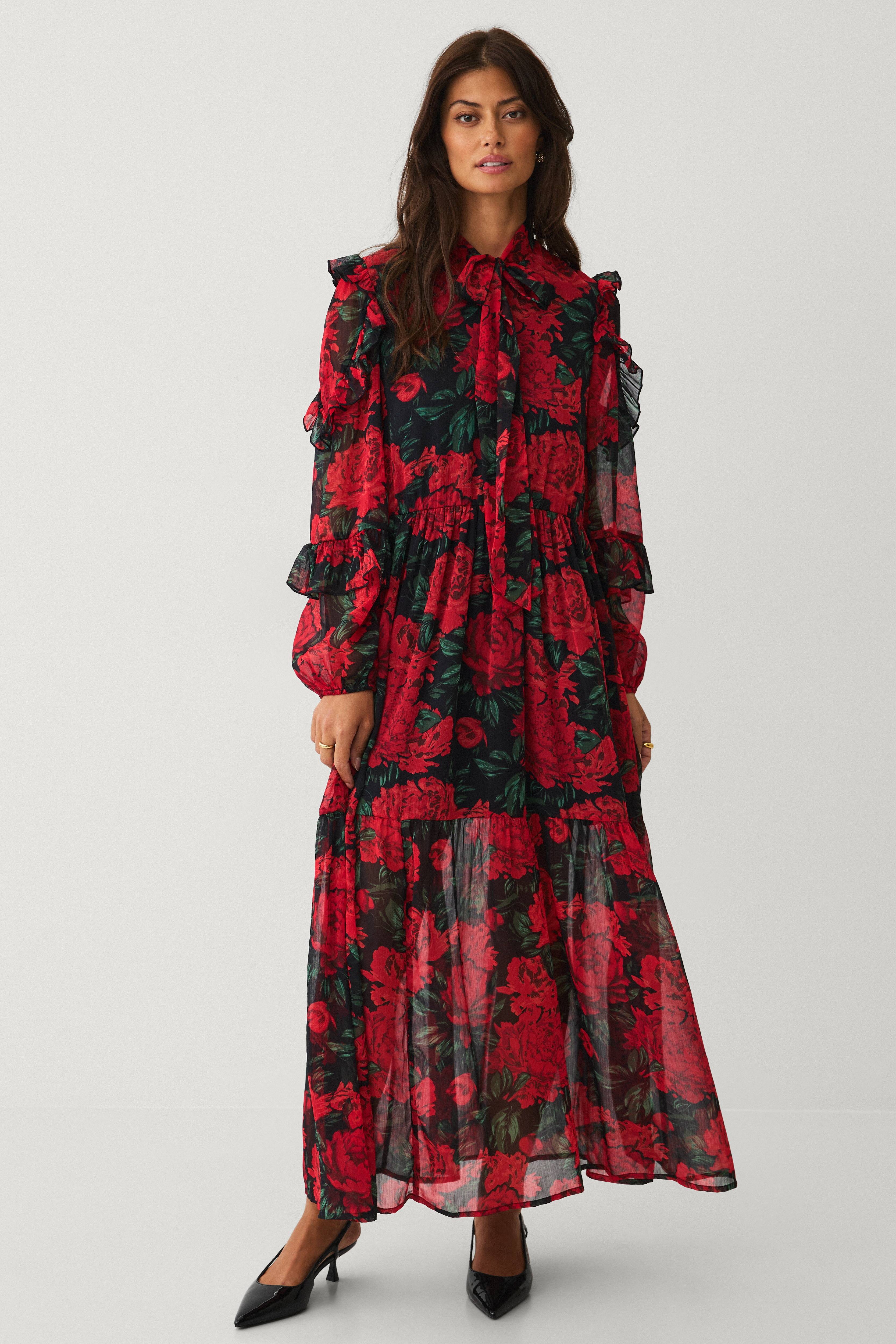 • Lang, foret kjole i chiffon med blomstermønster• Rund halsudskæring med knudedetalje og slids• Udskæring med samling ved taljen• Lange, uforede ærmer med volanter og elastik ved manchetterne• Volant nederst• Længde: 140 cm i størrelse S