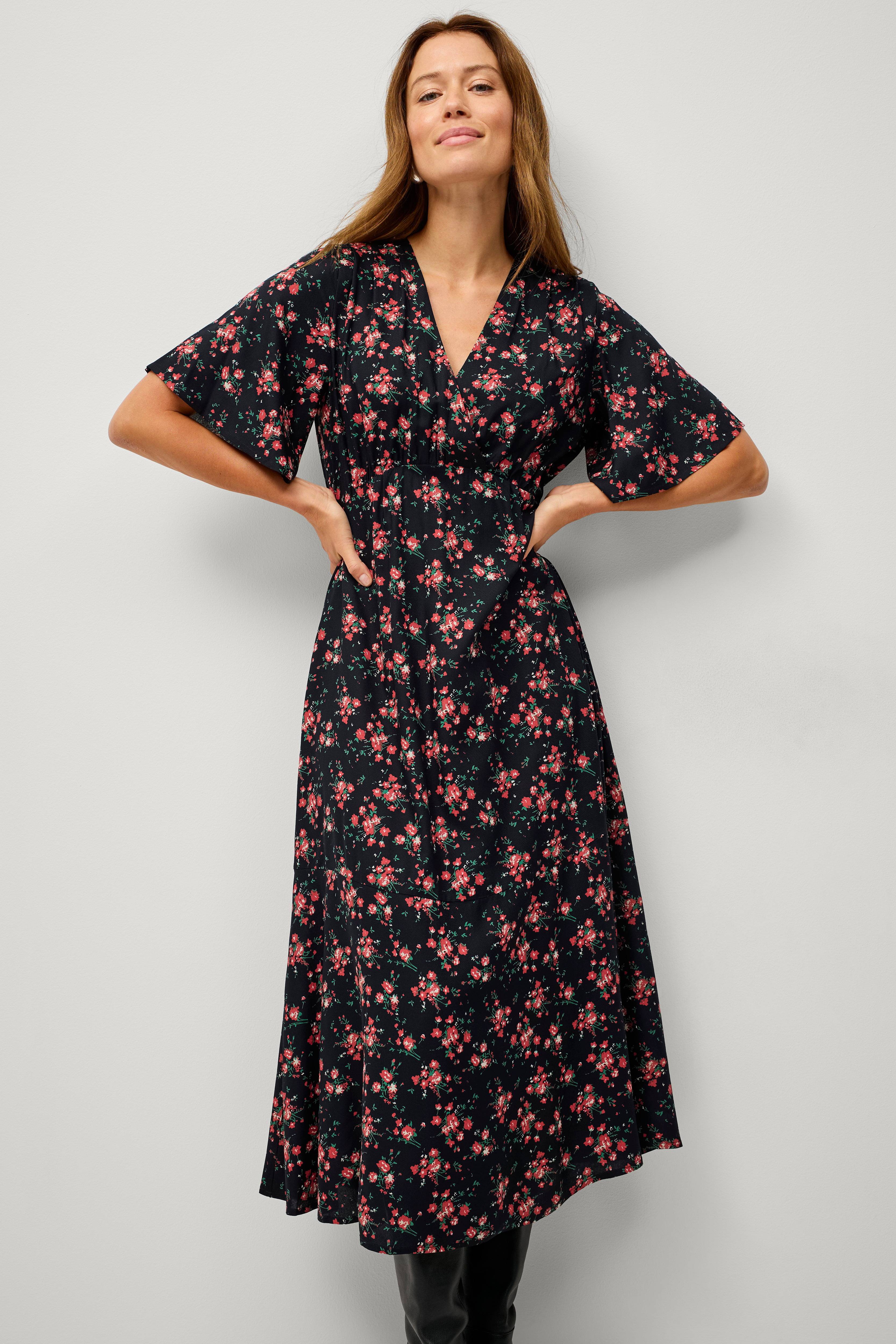 • Model med svaj med slå-om design oppe foran • Læg på skuldrene • Kort, bredt ærme • Defineret talje med elastik bagpå • Længde: 127 cm i størrelse 36