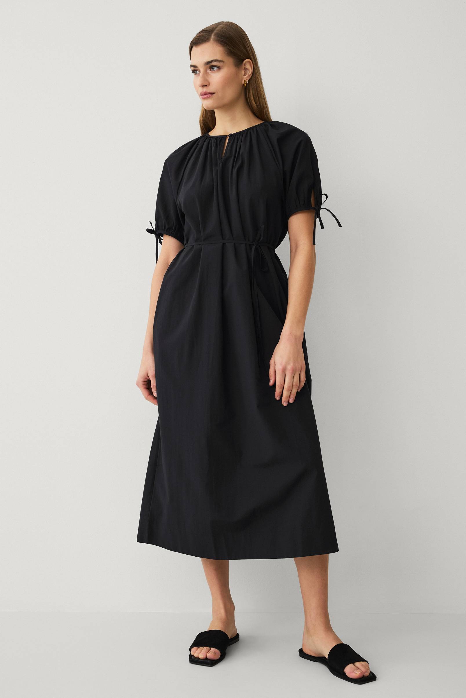 • Lang kjole i sprød bomuldsblanding• Rund, rynket halsudskæring med nøglehulsåbning og knap foran• Korte, struttende ærmer med knudedetalje ved ærmeafslutningerne• Tyndt bindebælte ved taljen• Sidelommer• Længde: 130 cm i størrelse S