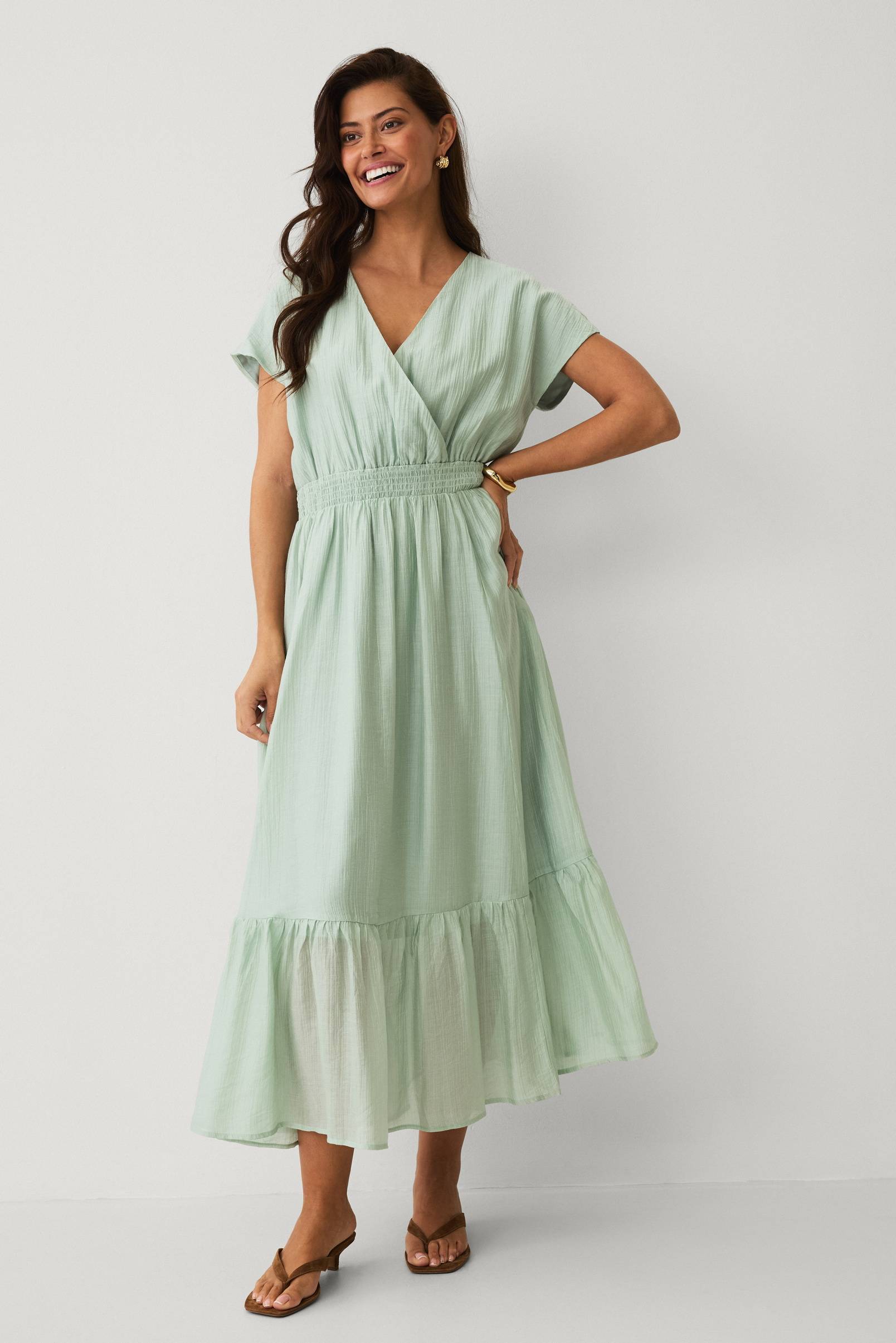 • Lang, ærmeløs kjole i let krøllet kvalitet• V-udskæring med slå-om design• Elastisk smock ved taljen• Nederdel med svaj med bred volant nederst• Foret• Længde: 134 cm i størrelse S