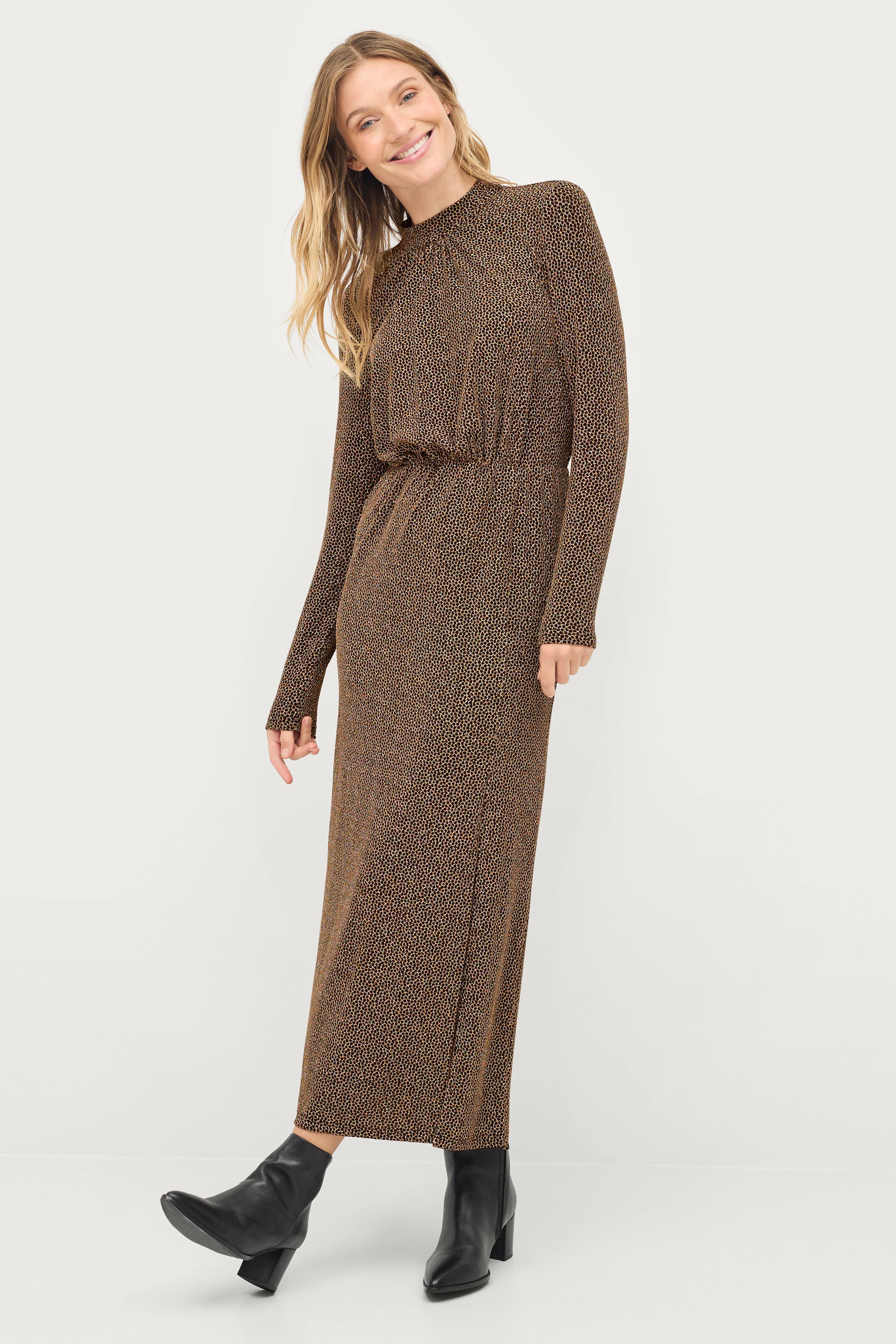 • Maxi kjole i elastisk jersey med guldfarvet mønster• Rund, høj halsudskæring• Slids med knap i nakken• Elastisk udskæring ved taljen med samling• Længde: 139 cm i størrelse 34/36