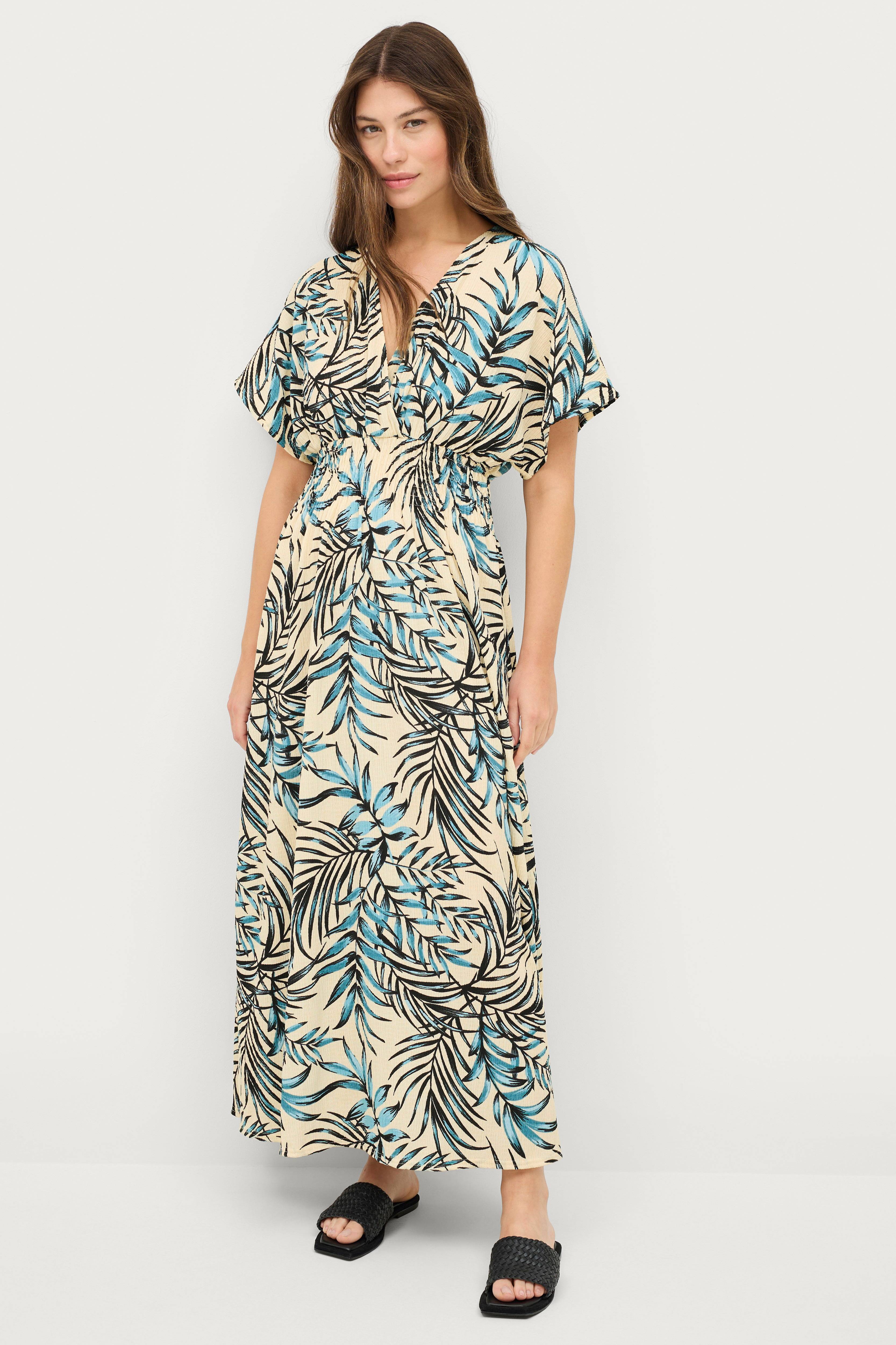 • V-udskæring med slå-om foran • V-udskæring med bindebånd bagpå • Kort, bredt ærme • Bred, elastisk smock ved taljen • Slidser i siderne • Rynket kvalitet • Længde: 135 cm i størrelse 34/36