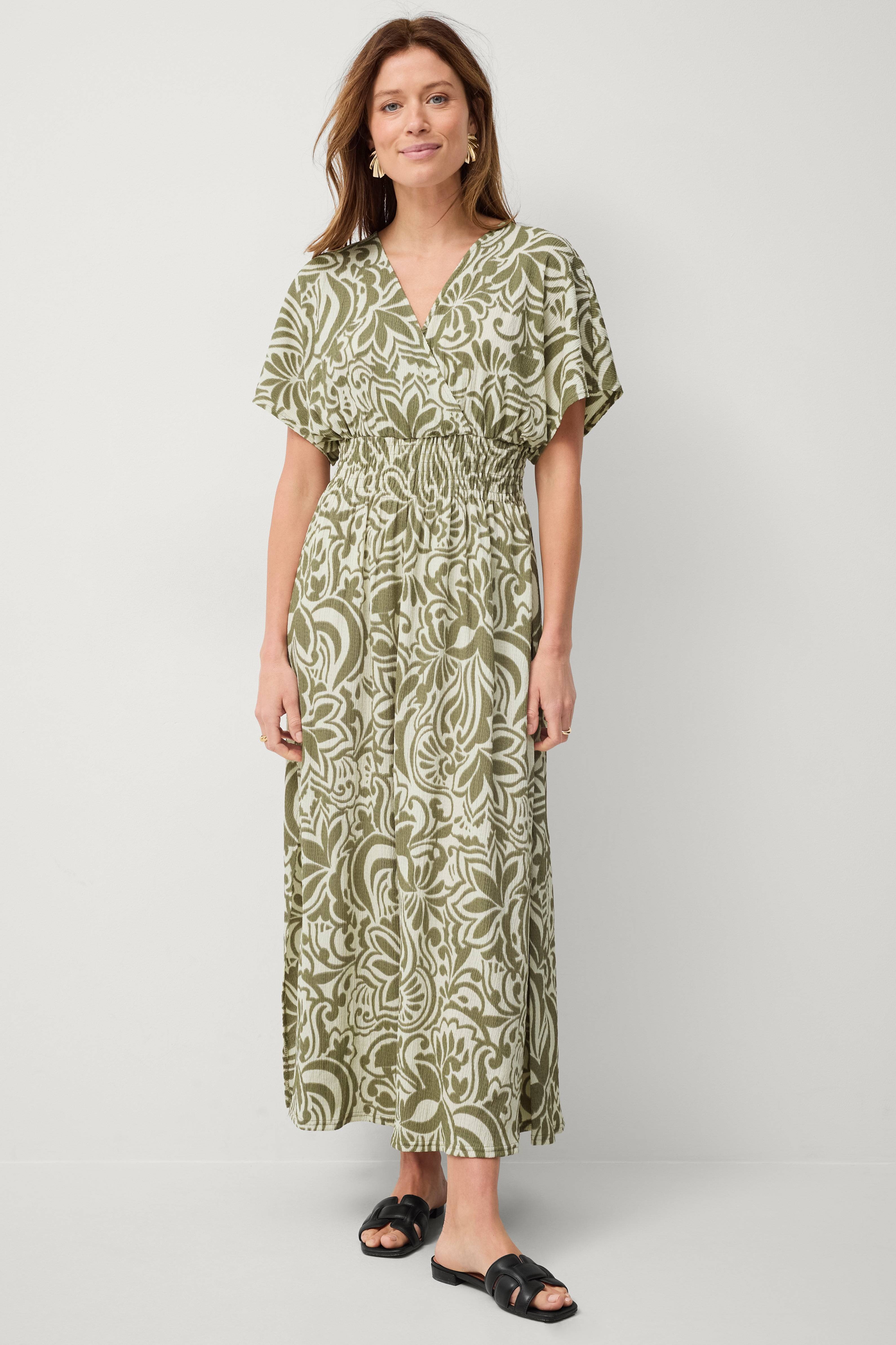 • V-udskæring med slå-om foran • V-udskæring med bindebånd bagpå • Kort, bredt ærme • Bred, elastisk smock ved taljen • Slidser i siderne • Rynket kvalitet • Længde: 135 cm i størrelse 34/36