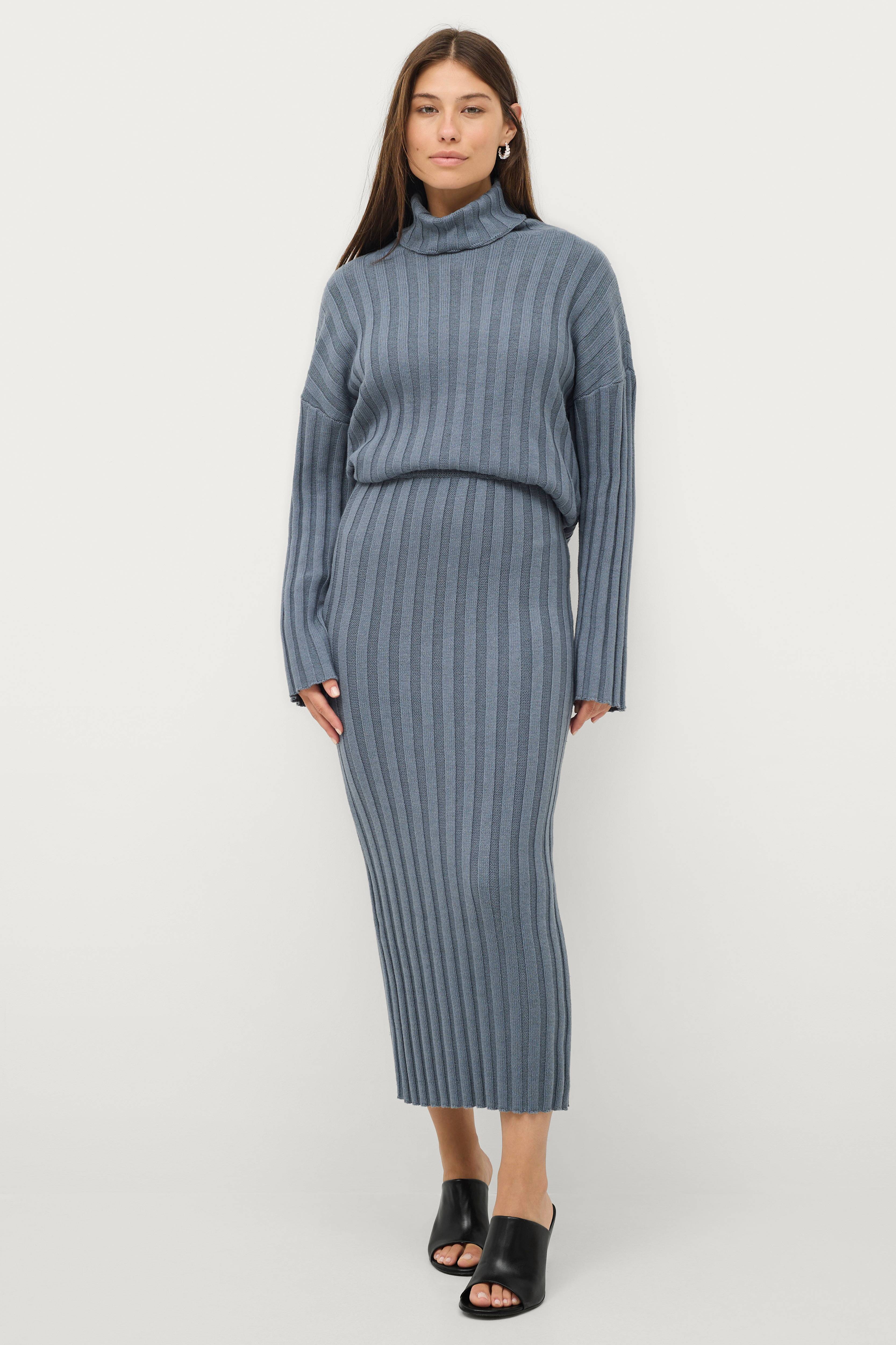 • Lang, ribstrikket nederdel• Figursyet pasform• Elastisk talje• Slids bagpå• Længde: 96 cm i størrelse 34/36