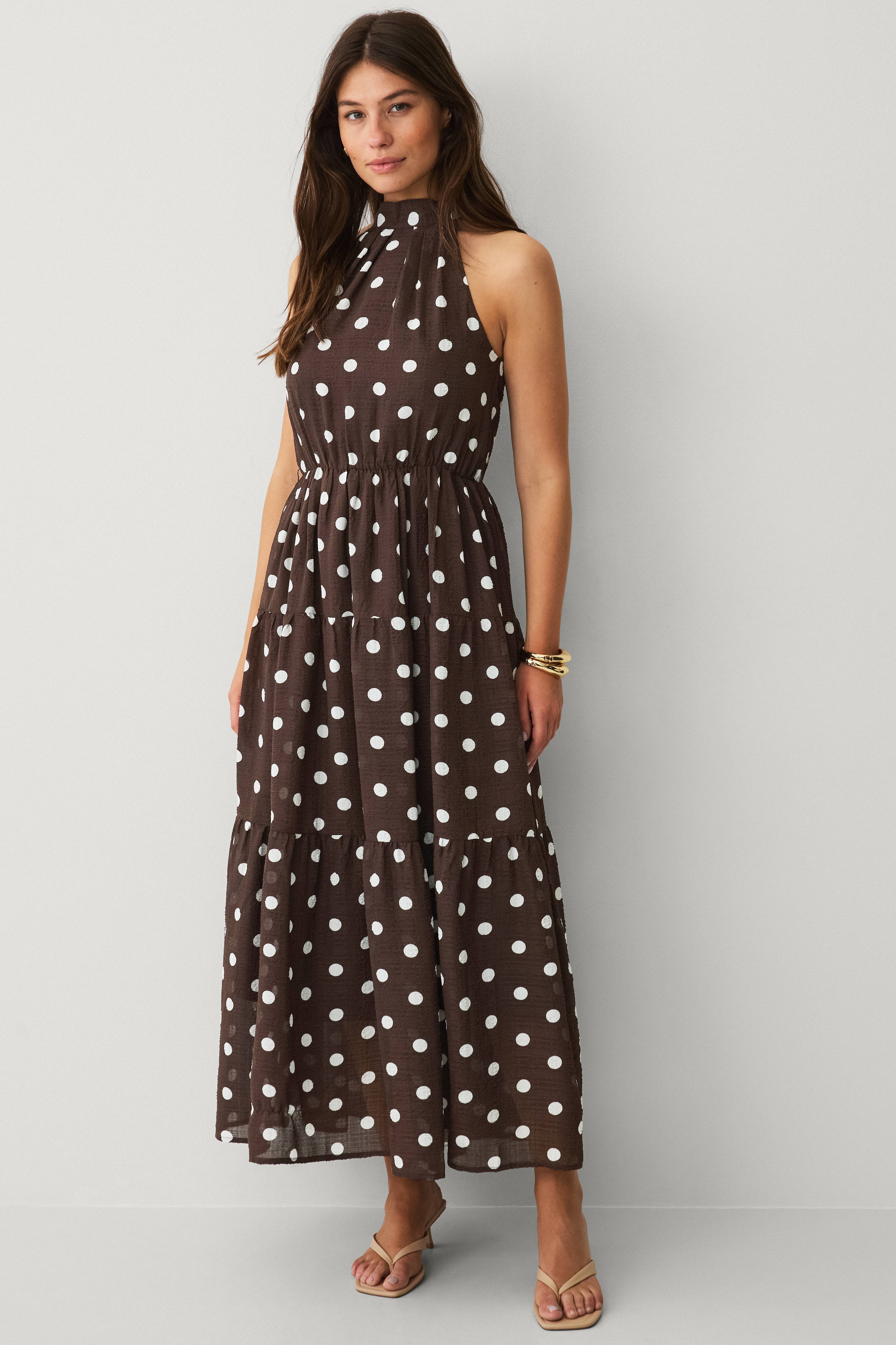 • Lang, ærmeløs kjole med behandlet stof• Halterneck med læg foran og to knapper i nakken• Vævet, tyndt for• Elastisk talje med aftageligt bindebælte• Nederdel med svaj med volant• Længde: 136 cm i størrelse 38
