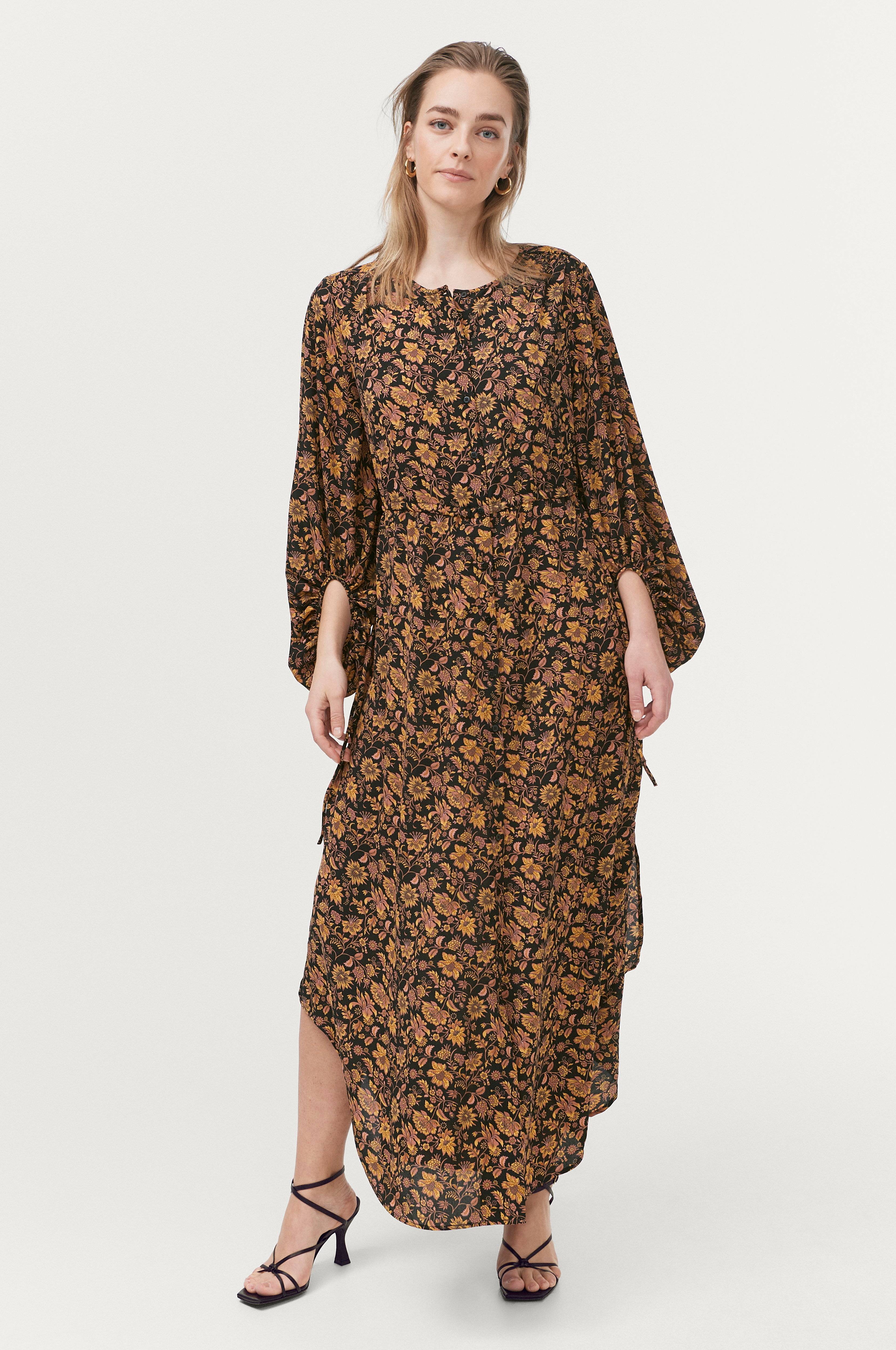 Maxikjole Teodora i A-formet model med meget vidde. Rund hals med smalt kantbånd og afskåret skulderbærestykke med rynk foran og bagpå. Lukning hele vejen ned foran og indsat løbegang i taljen med bindebånd i begge sider. 3/4-langt ærme med meget vidde og smalt kantbånd i ærmekanten. Vævet kvalitet. Længde ca. 143 cm i str. 38.
