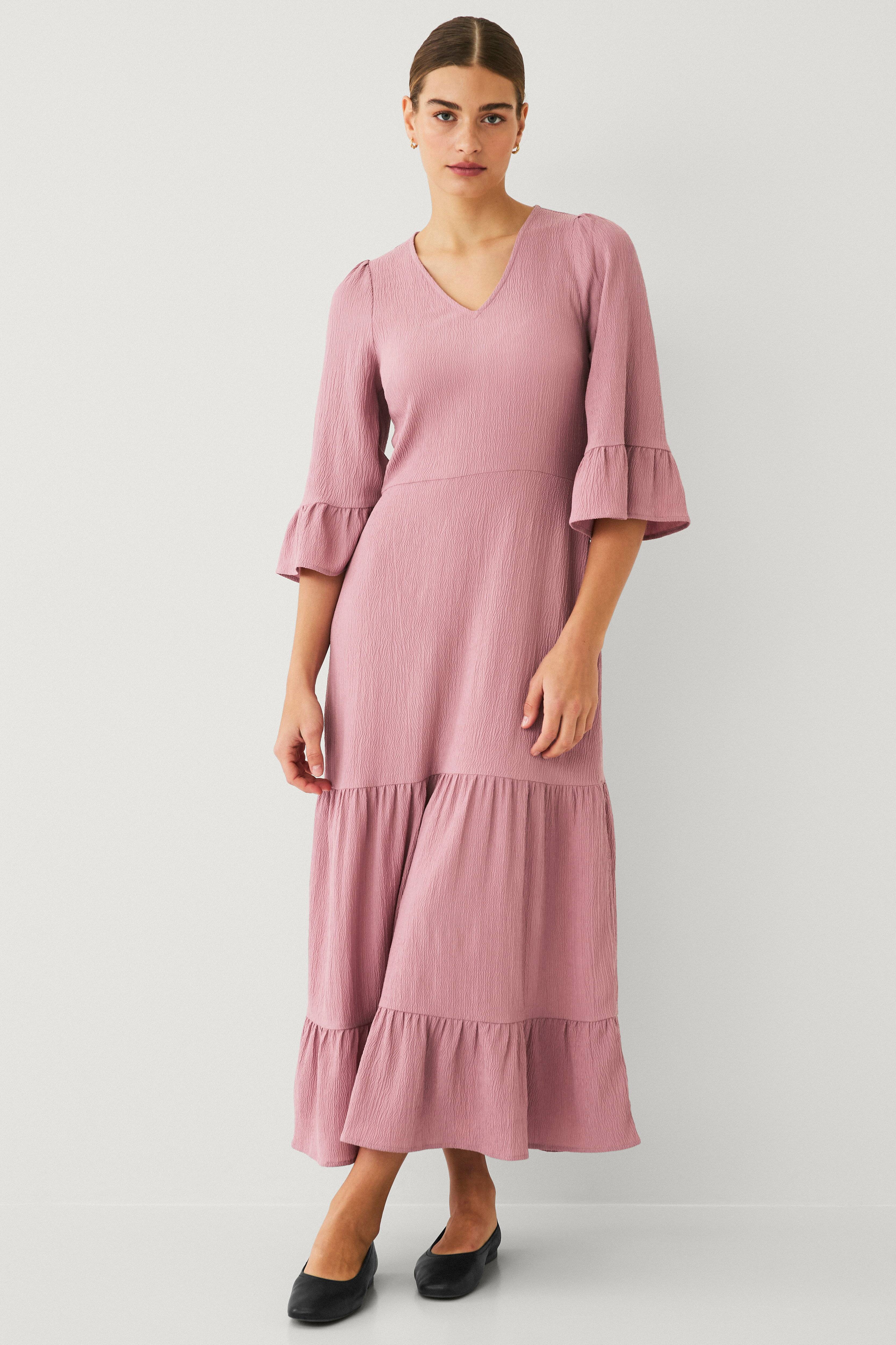 • Mønstervævet, let maxi kjole med volanter • Skjult lynlås i siden • V-formet halsudskæring • 3/4 lange arme med volanter • Længde: 134 cm i størrelse S