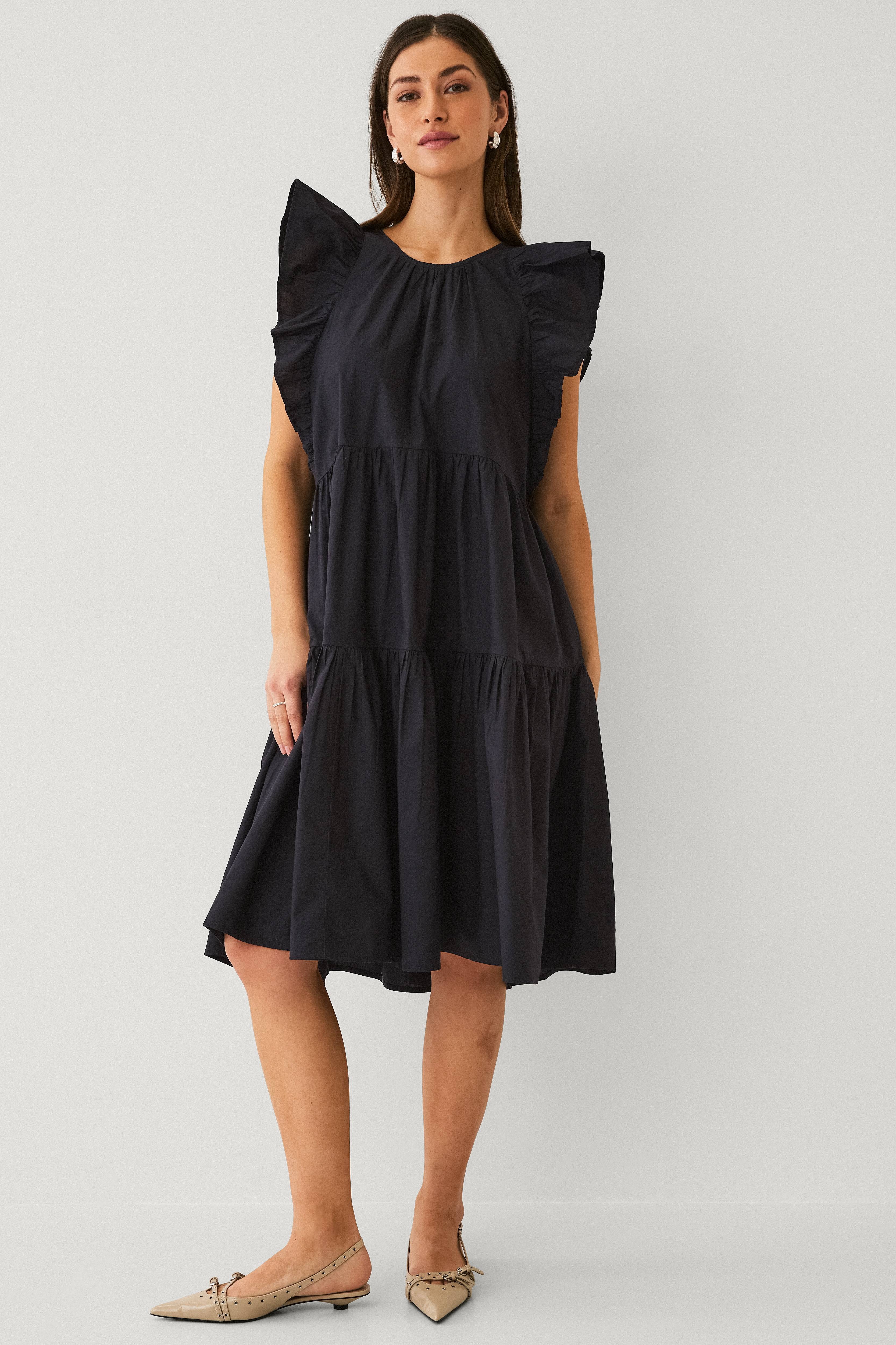 • Ærmeløs kjole i luftig bomuld med volanter over skuldrene • Flæsedesign på den nederste del • Midilængde • Afrundet halsudskæring • Åbning med knap i nakken • Længde: 110 cm i størrelse S