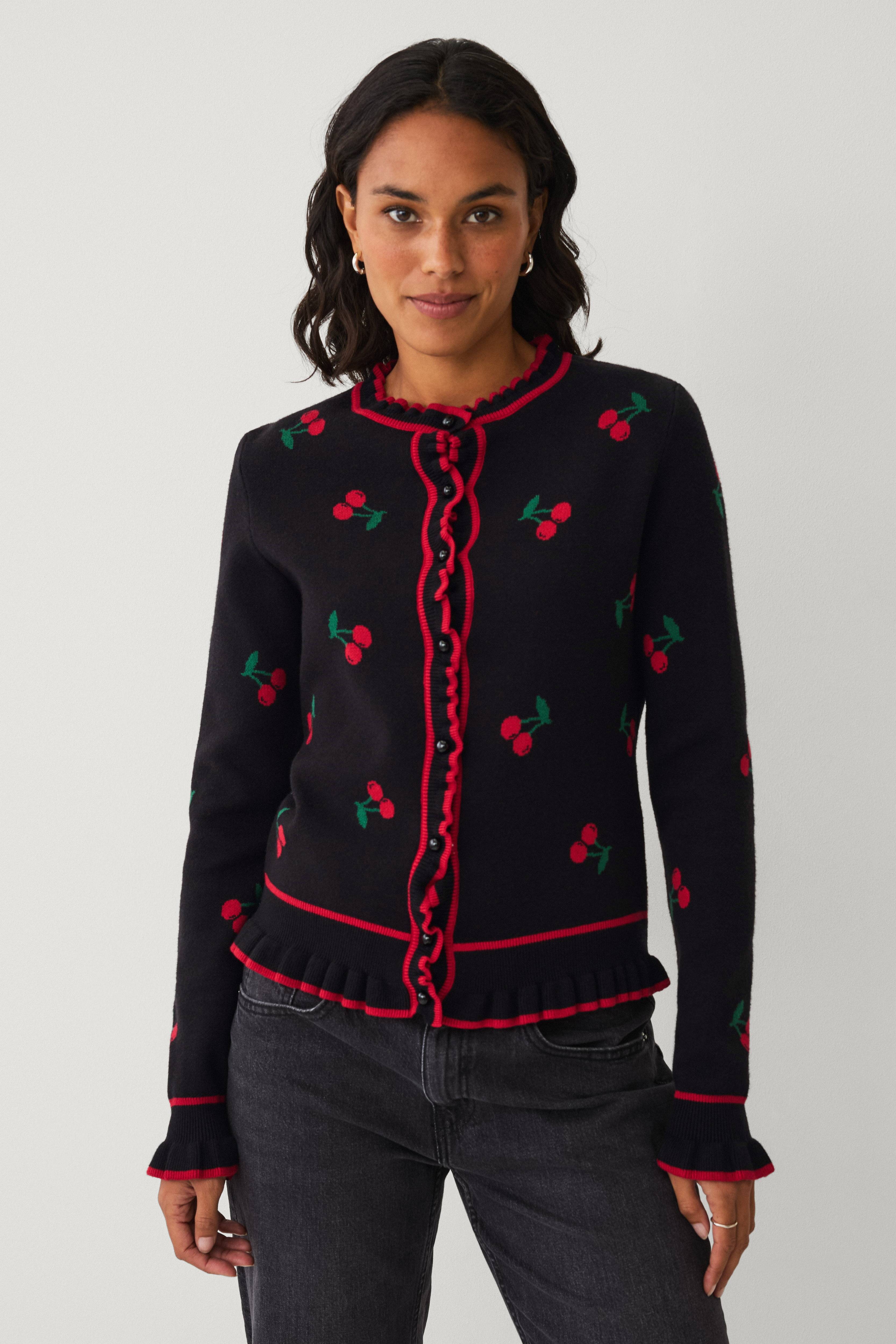 • Fintstrikket, langærmet cardigan med mønster• Volanter nederst, ved manchetterne, i halsen og ved fronten• Knapstolpe med perleknaper ved fronten• Længde: 57 cm i størrelse S