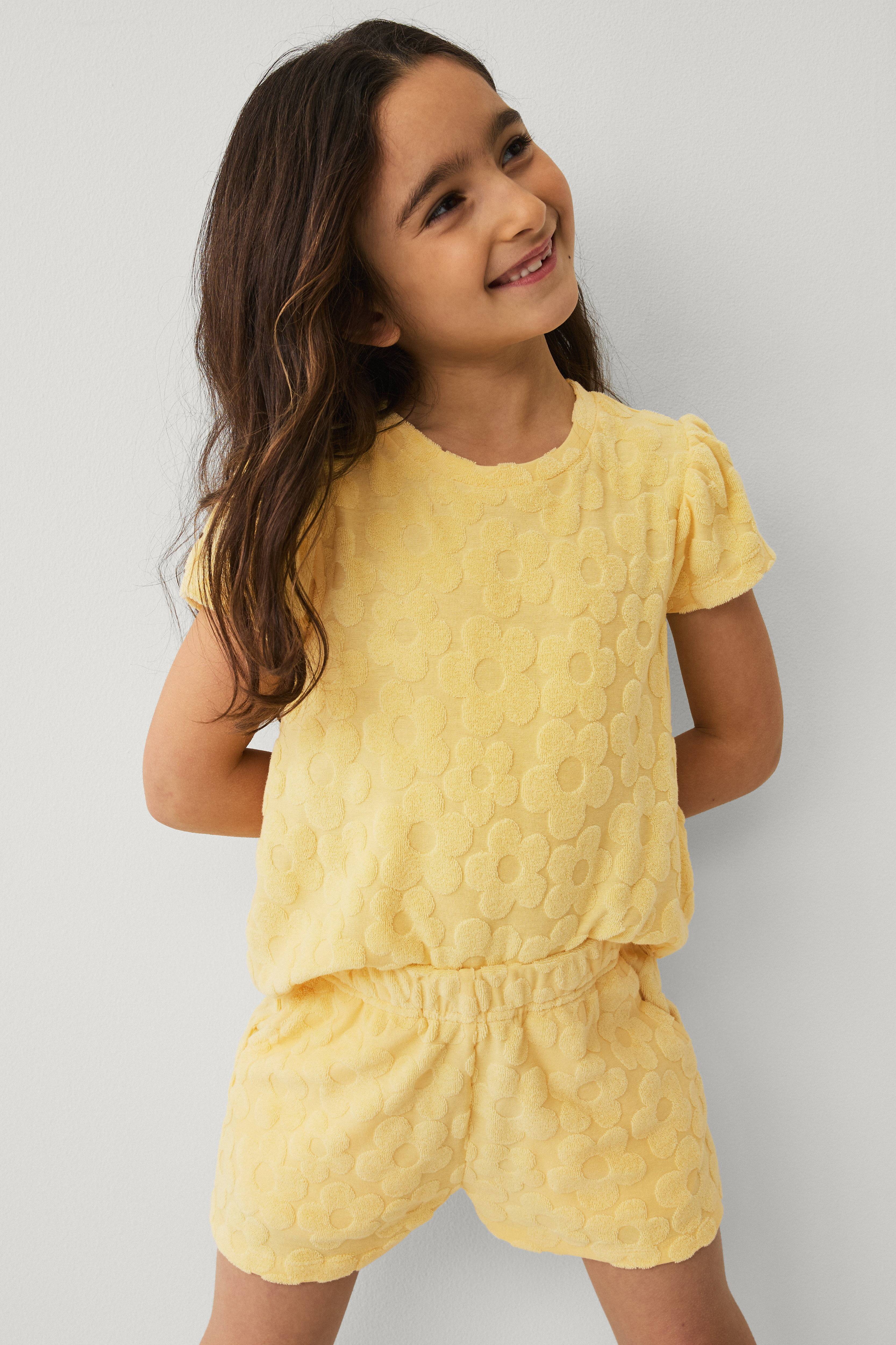 • Blødt, 2-delt sæt med jacquardmønster i frotté• A-linjeformet top med rund halsudskæring• Korte ballonærmer• Shorts med elastisk talje og sidelommer