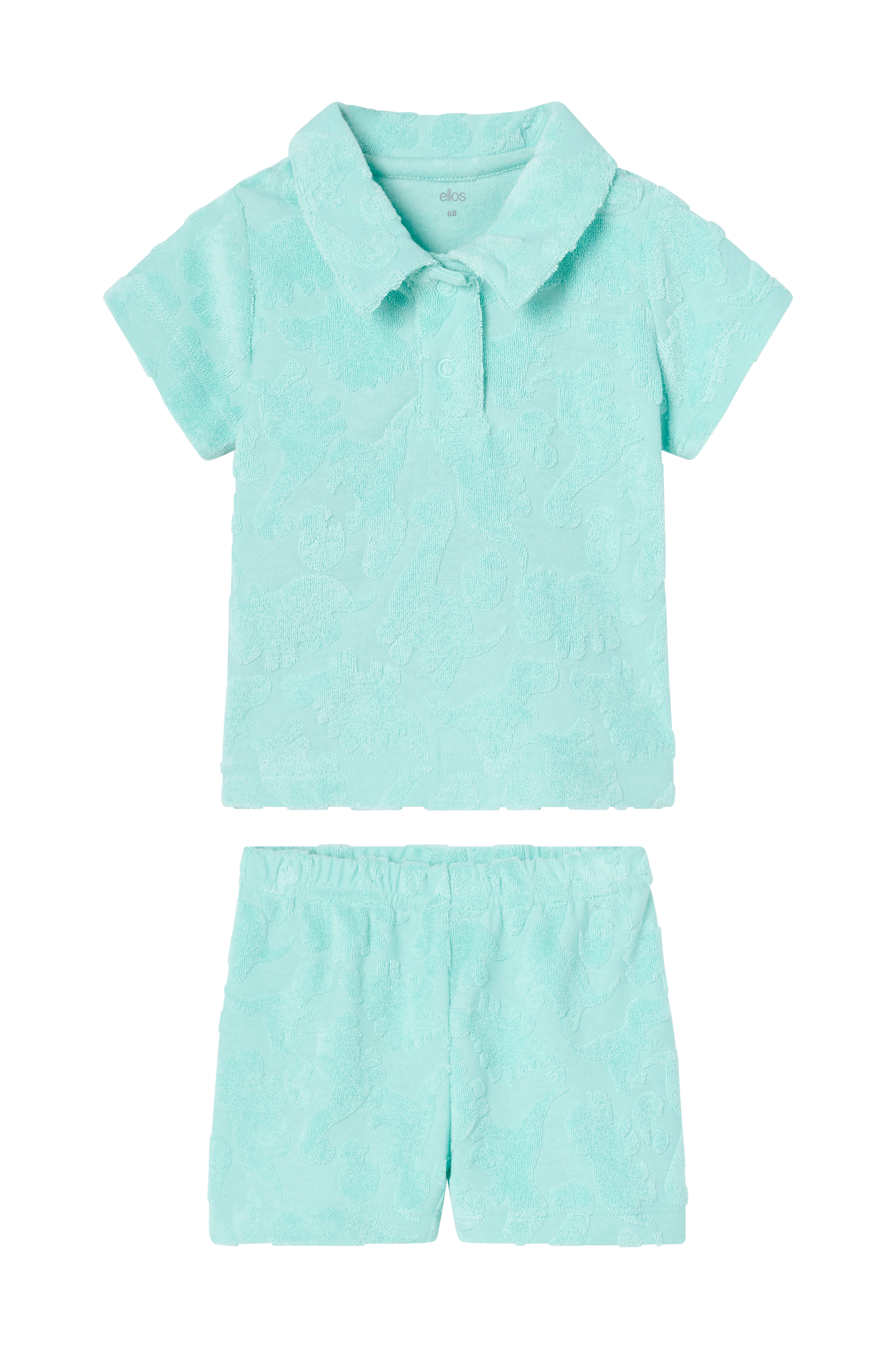 • Blødt, 2-delt sæt med jacquardmønster i frotté• Poloshirt med krave og kort knaplukning foran• Korte ærmer• Shorts med elastisk talje og sidelommer