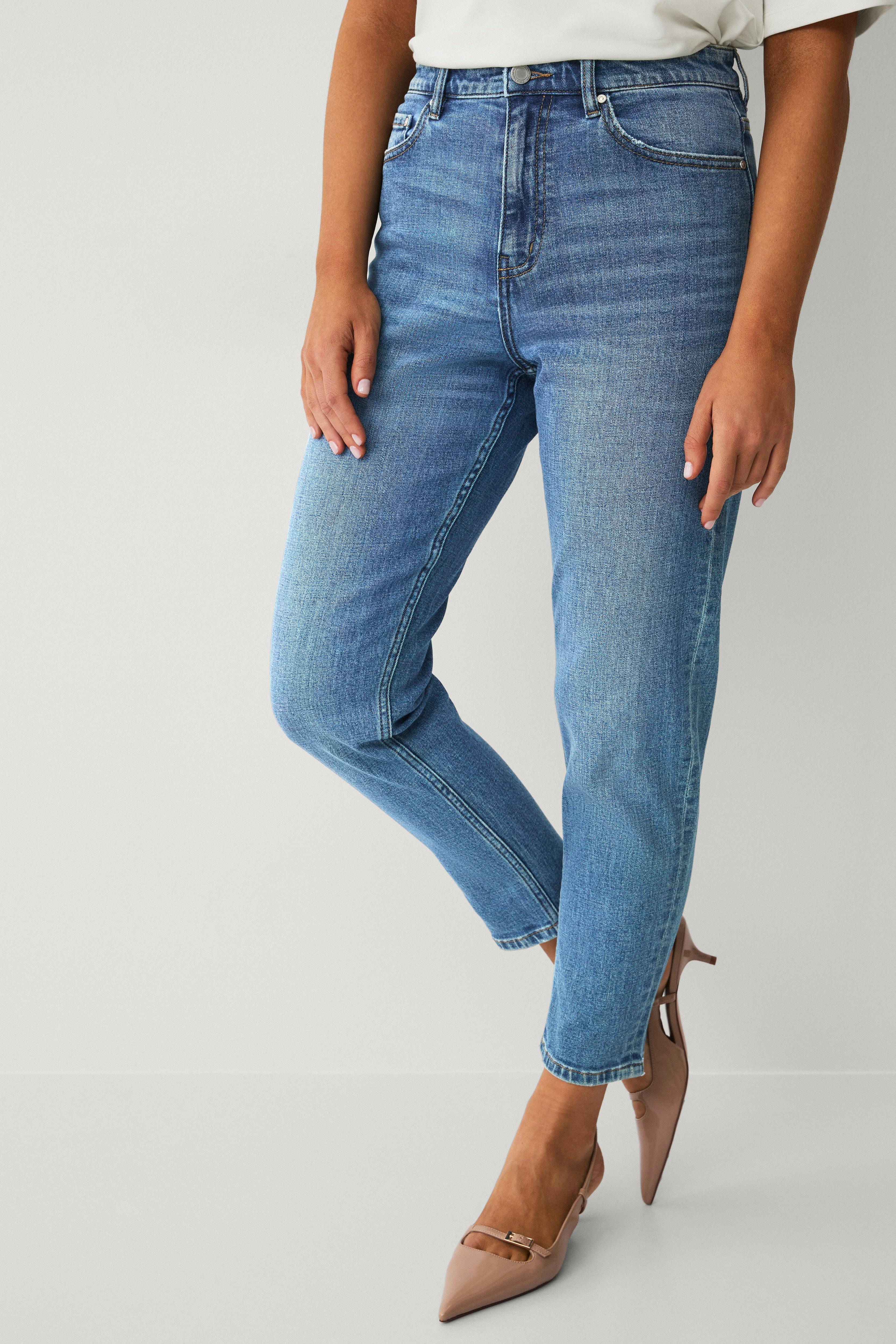 Dette er mit tredje par af disse jeans. Passende høje i taljen. Normale i længden til mine 163 cm. Passer i størrelsen. Bløde og behagelige. Giver sig en del.