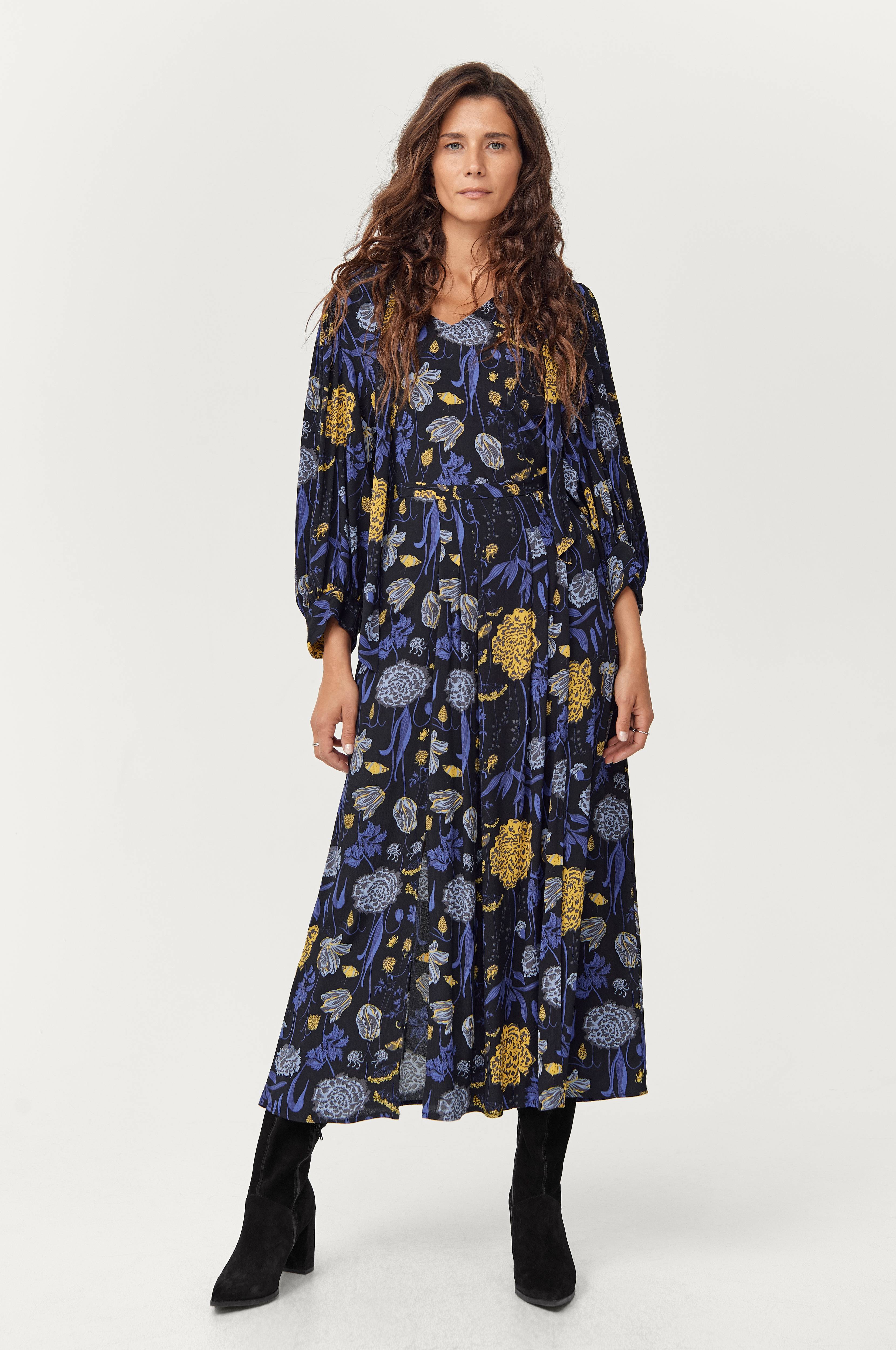 Nederdel Aurelie i A-formet model med skøn vidde og nedsyede læg rundt om foroven. Smal, påsyet linning med skjult lynlås bagpå og høje slidser i kanten forneden foran. Vævet crepekvalitet med printet mønster og blødt fald. Længde ca. 94 cm.
