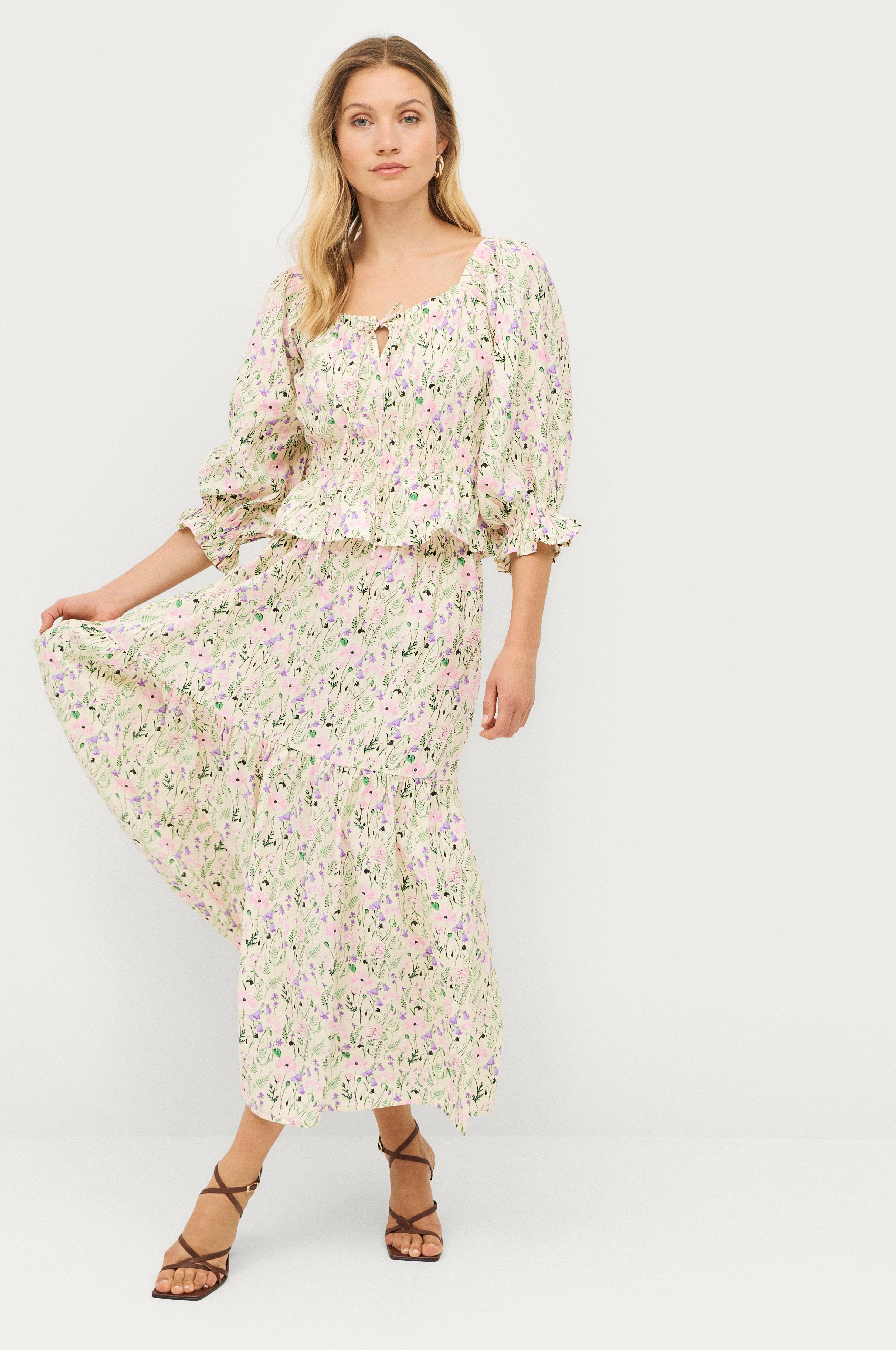 • Lang nederdel• Elastisk talje• Model med svaj med volant• Længde: 92 cm i størrelse 34/36