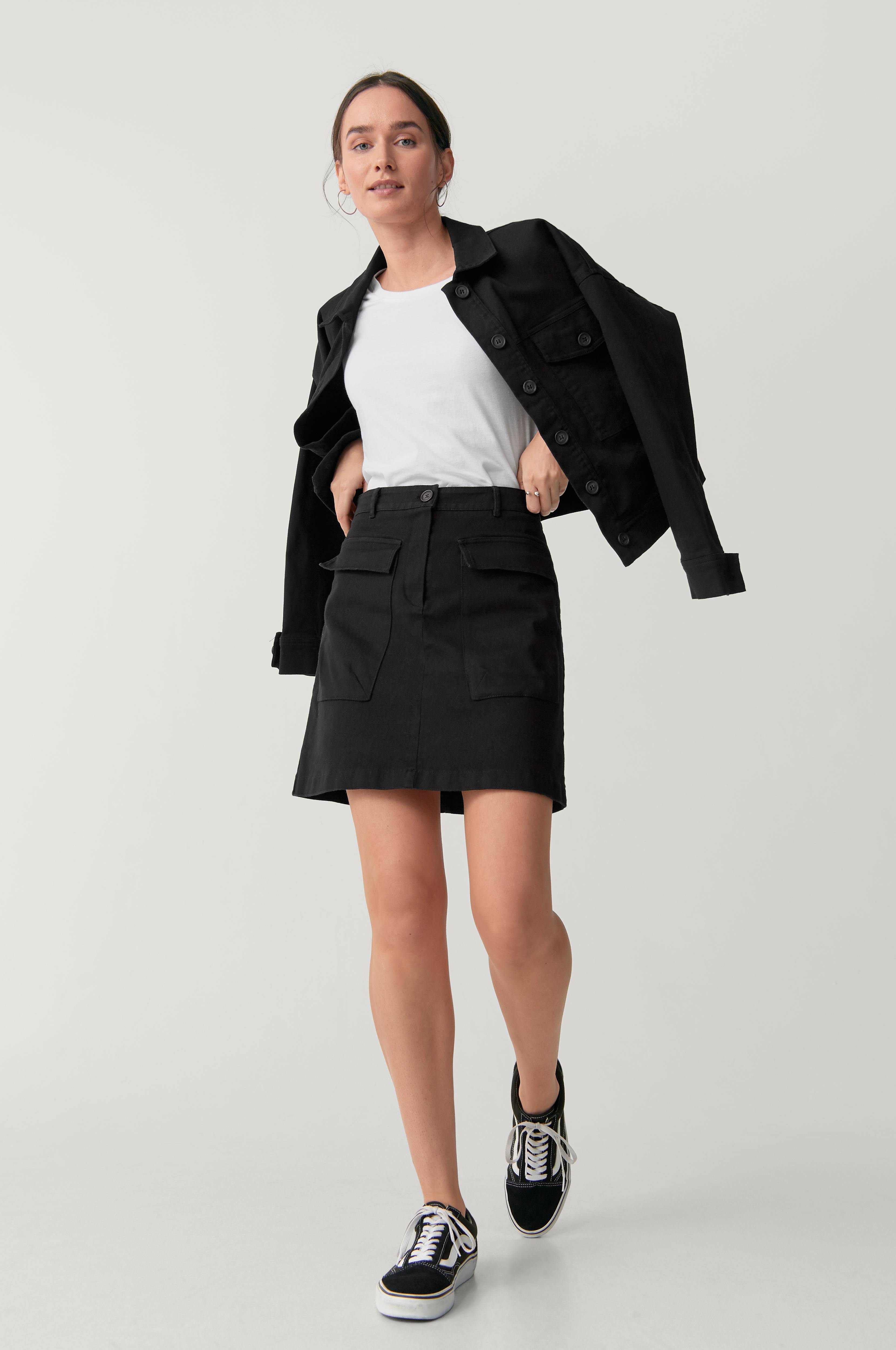 Nederdel Hilda i kort, let A-formet model med store bælglommer foran, som også har lommeklap. Linning med bæltestropper og lynlås foran. Vævet stretchkvalitet af bomuld. Længde ca. 45 cm i str. 36.