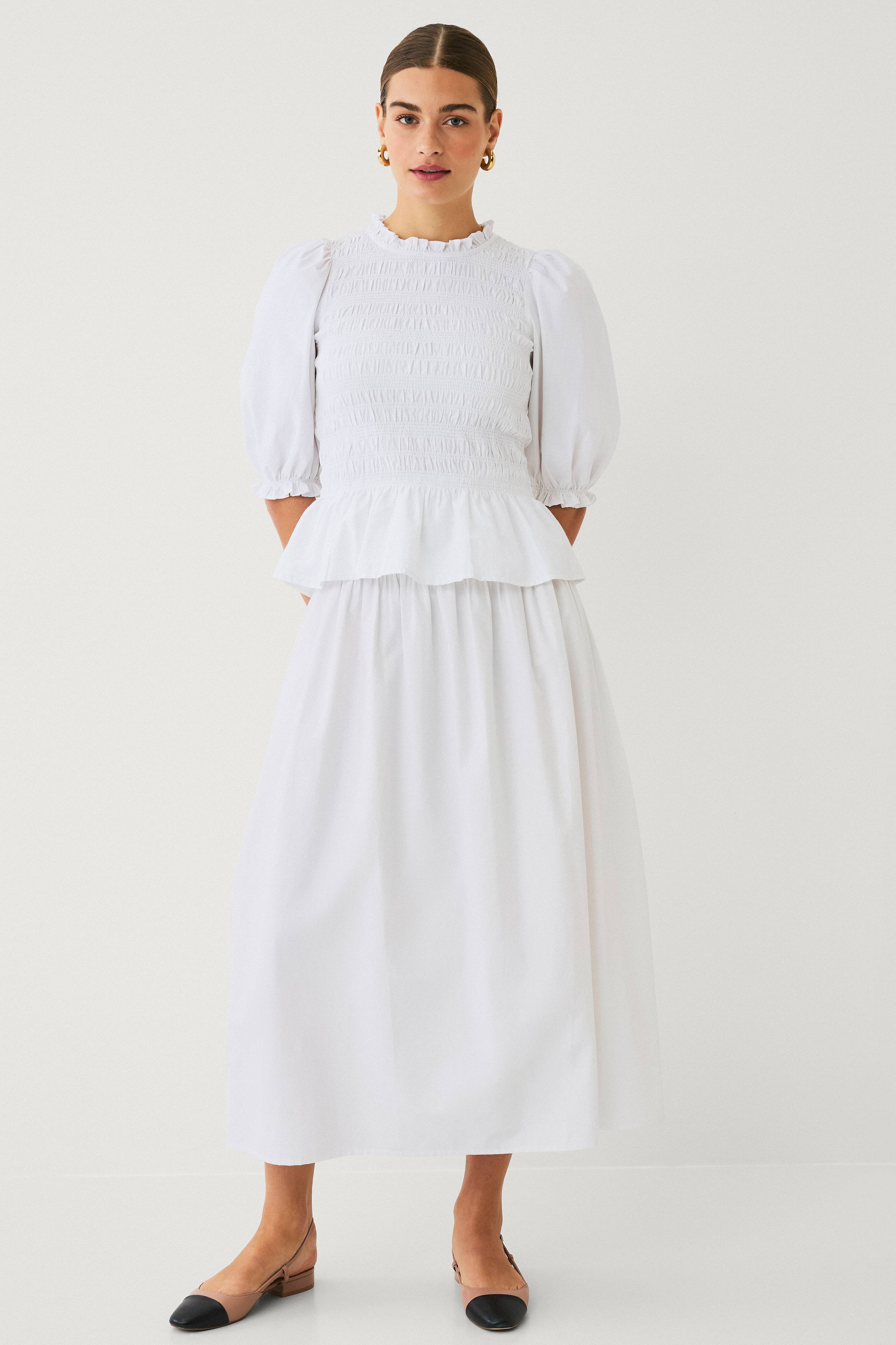 • Nederdel i bomuldsblanding med meget volumen• Høj talje med smock• Længde: 95 cm i størrelse S