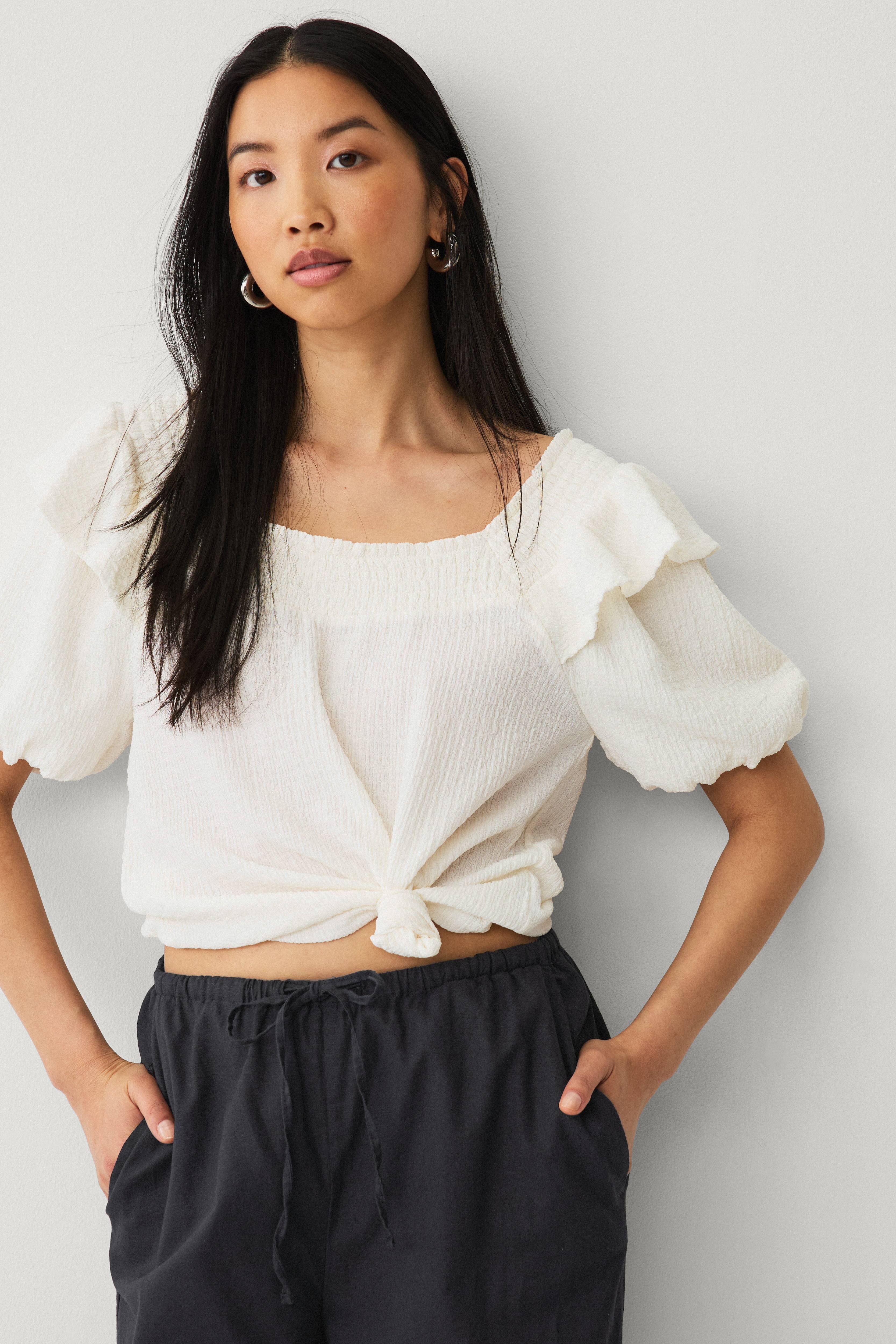 • Kort, raglan-skåret ballonærme med volant øverst