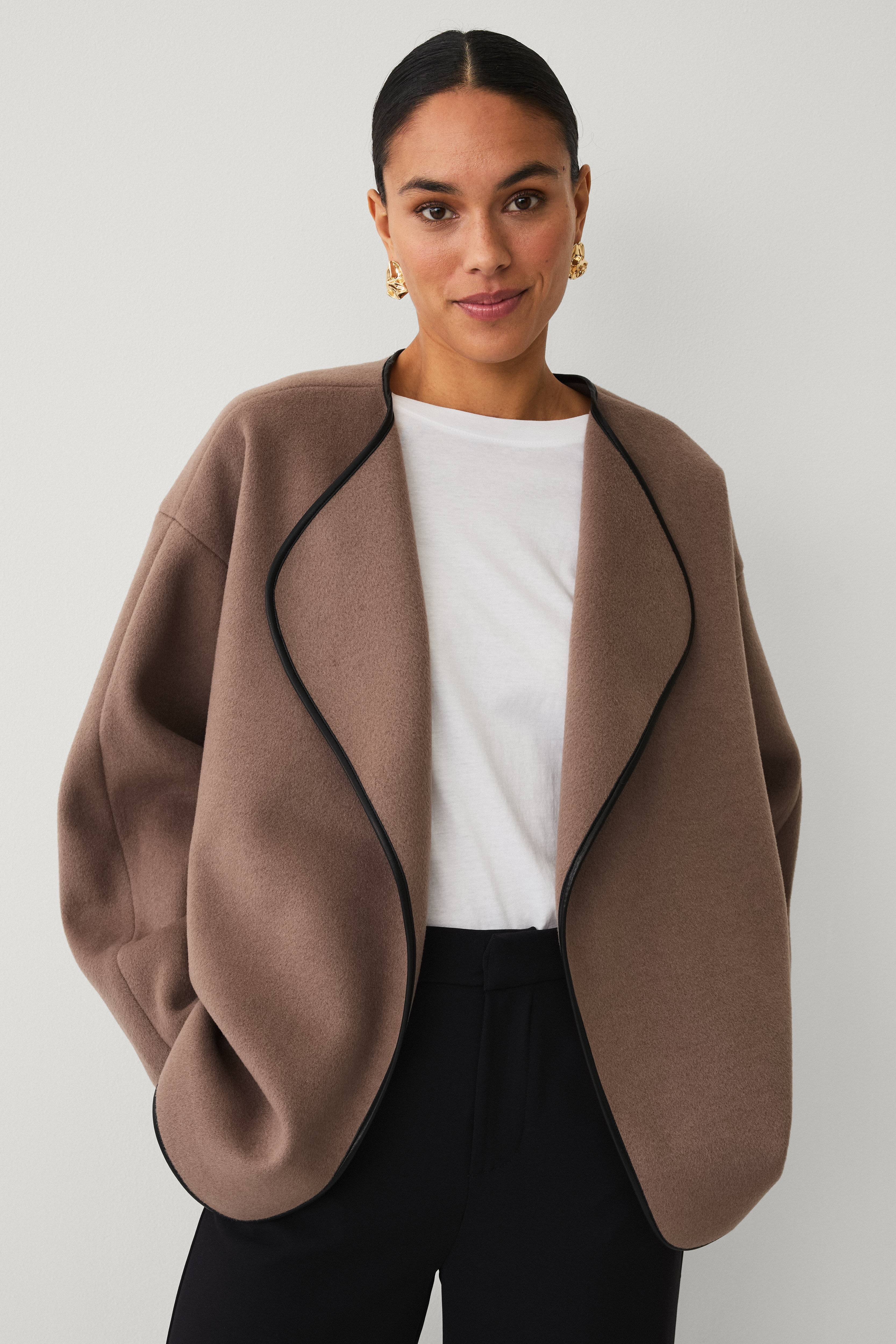 • Oversized jakke med sjalskrave og åben front• Tyndt, aftageligt bindebælte ved taljen• Detaljer i imiteret læder• Længde: 65 cm i størrelse M