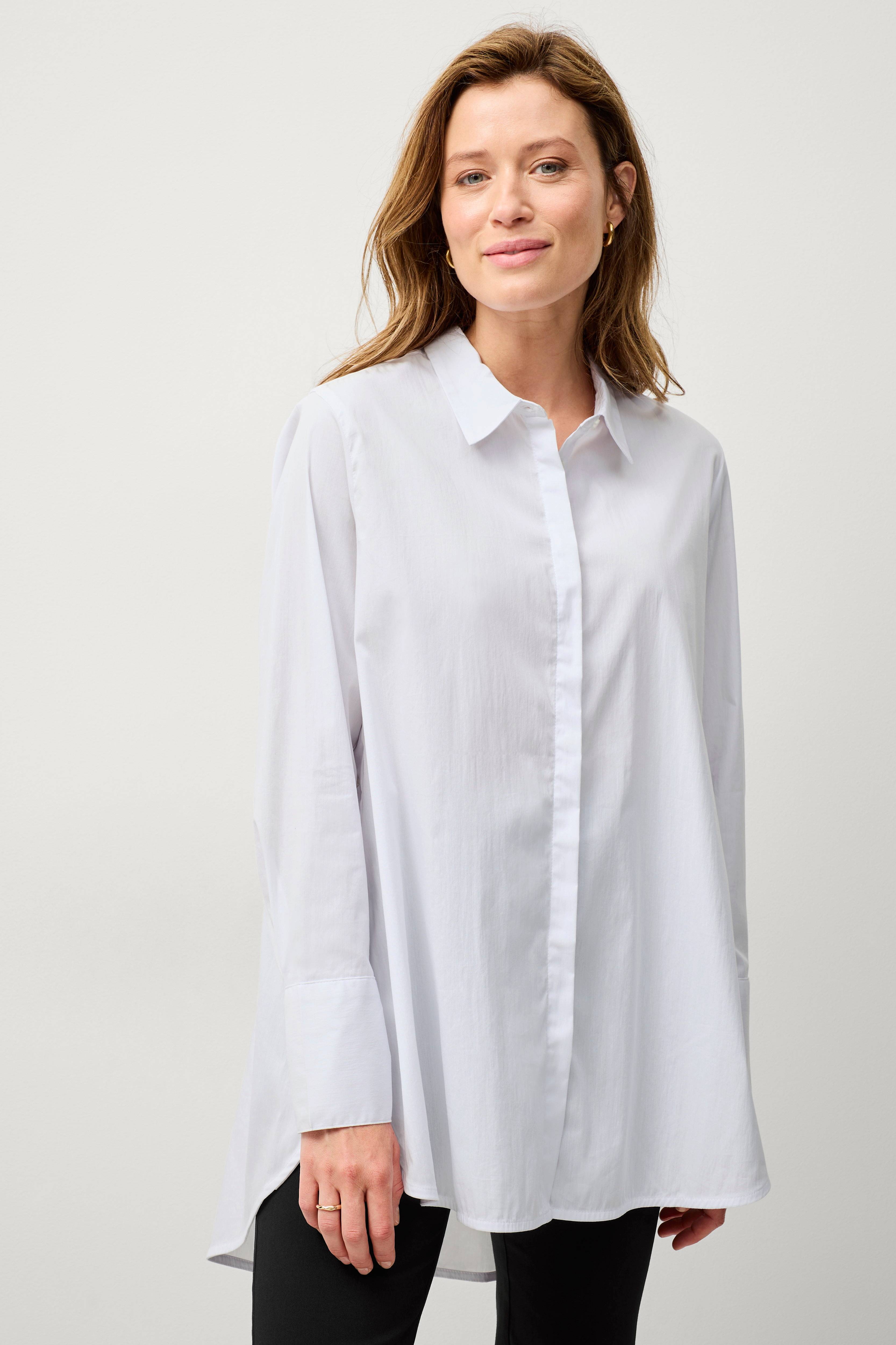 En længere skjorte i overstørrelse med lille krave og skjulte knapper foran. Omløbende sidesømme med knaplukning i midten og afrundede slidser forneden. Afskåret skulderstykke med læg bagpå og lange ærmer med bred manchet. Rundskåret forneden med længere bagstykke. Længde bagpå ca. 85 cm i størrelse 38.