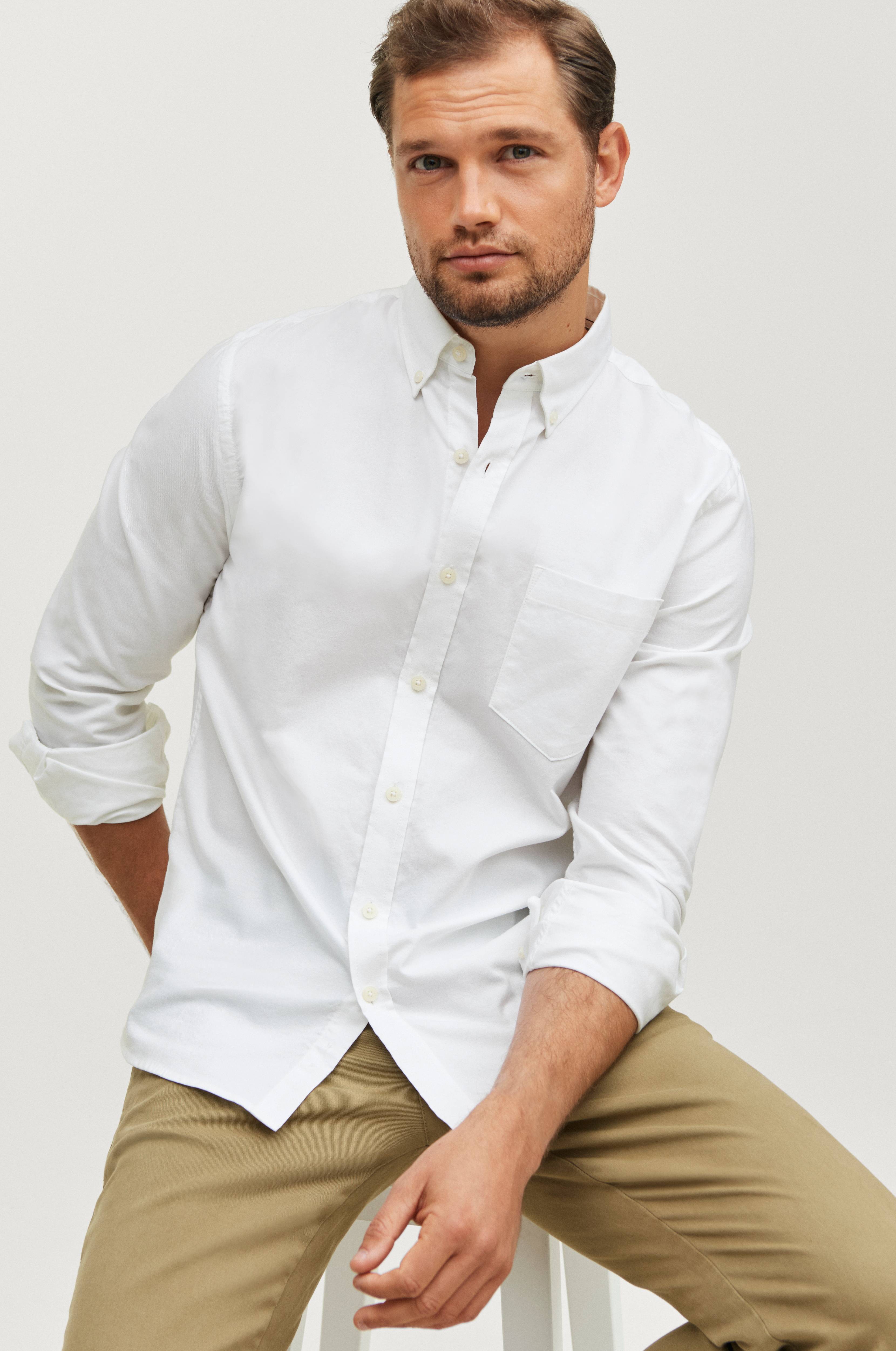 Oxfordskjorte Jake fra On Our Terms med button down-krave og brystlomme. Langt ærme med manchet og knapper. Afrundet kant forneden som er noget længere bagpå. Længde foran ca. 72 cm i str. M.