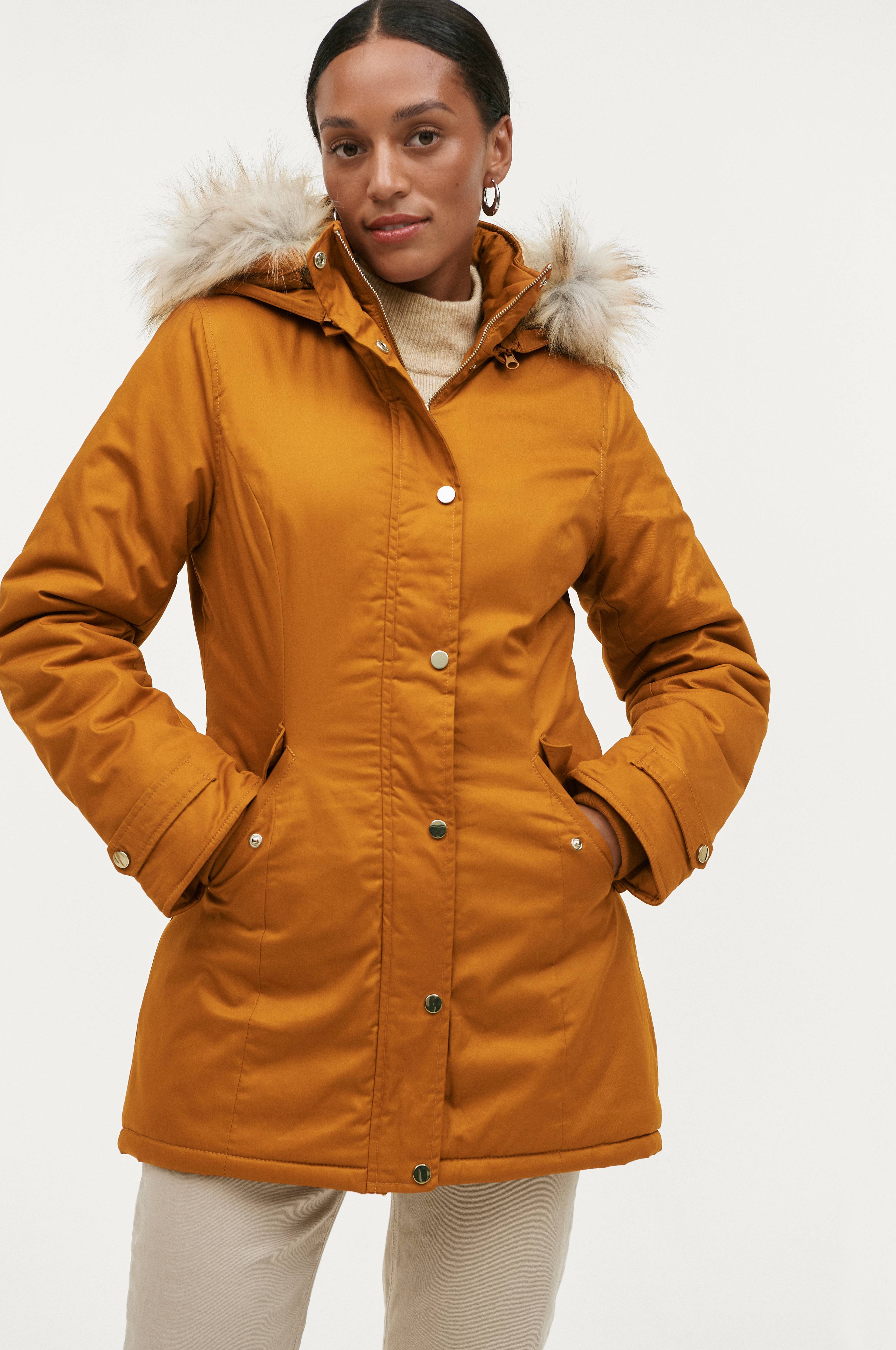 Parkacoat Nella i figursyet model. Stolpelukning med skjult lynlås og trykknapper samt to indsatte lommer med lommeklap. Høj, vatteret krave og aftagelig hætte med aftagelig kant af kunstpels. Ærme med justerbar knaptamp forneden og indvendig ribkant. Vatteret, quiltet for og en inderlomme samt afrundet kant forneden bagpå, som er lidt længere. Længde bagpå ca. 85 cm i str. 36.