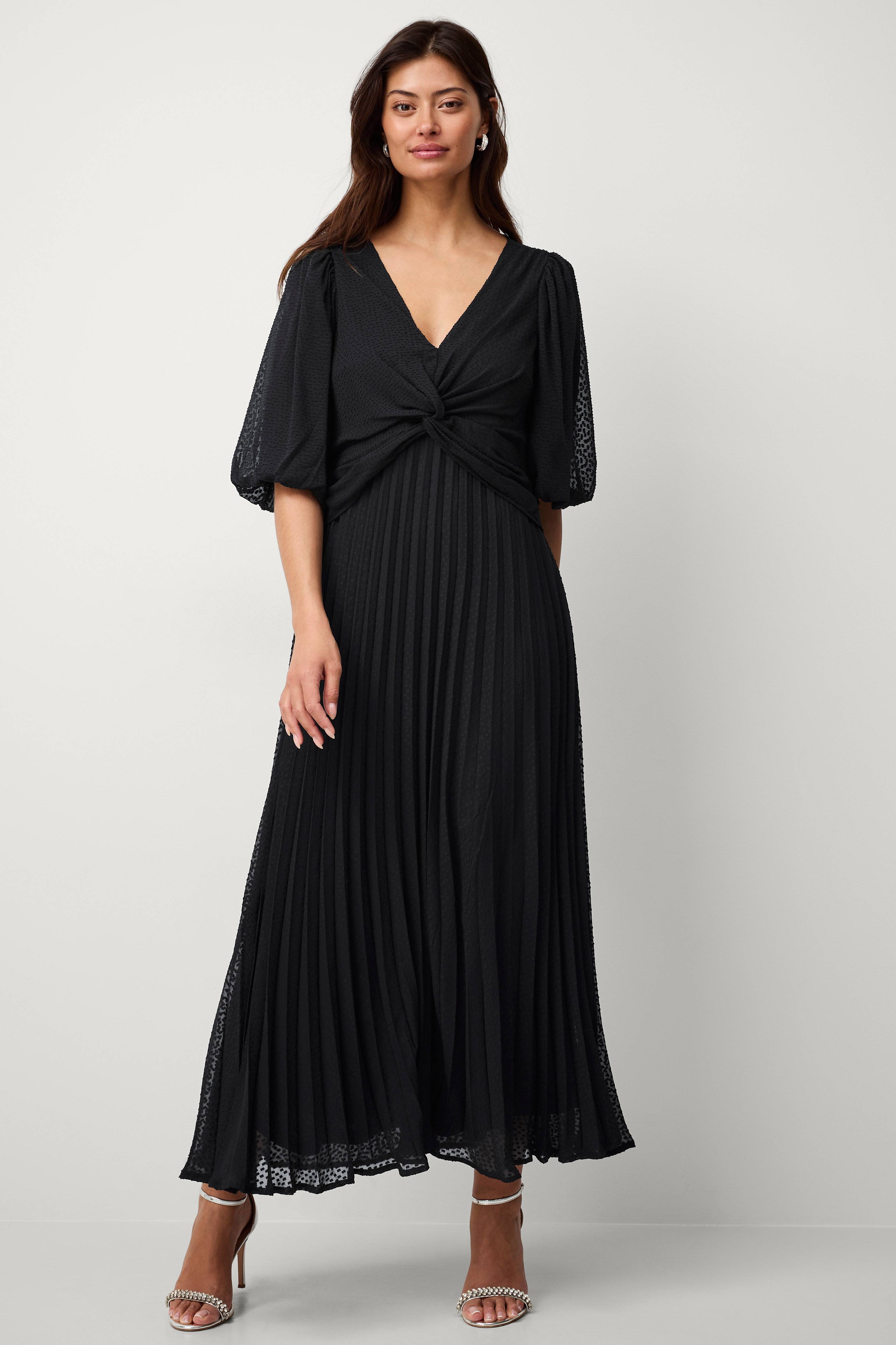 • V-udskæring• Knudedrapering foran• Halvlange ballonærmer• Plisseret nederdel• Skjult lynlås i siden• Fremstillet af chiffon med strukturmønster• Trikotfor• Længde: 130 cm i størrelse 36