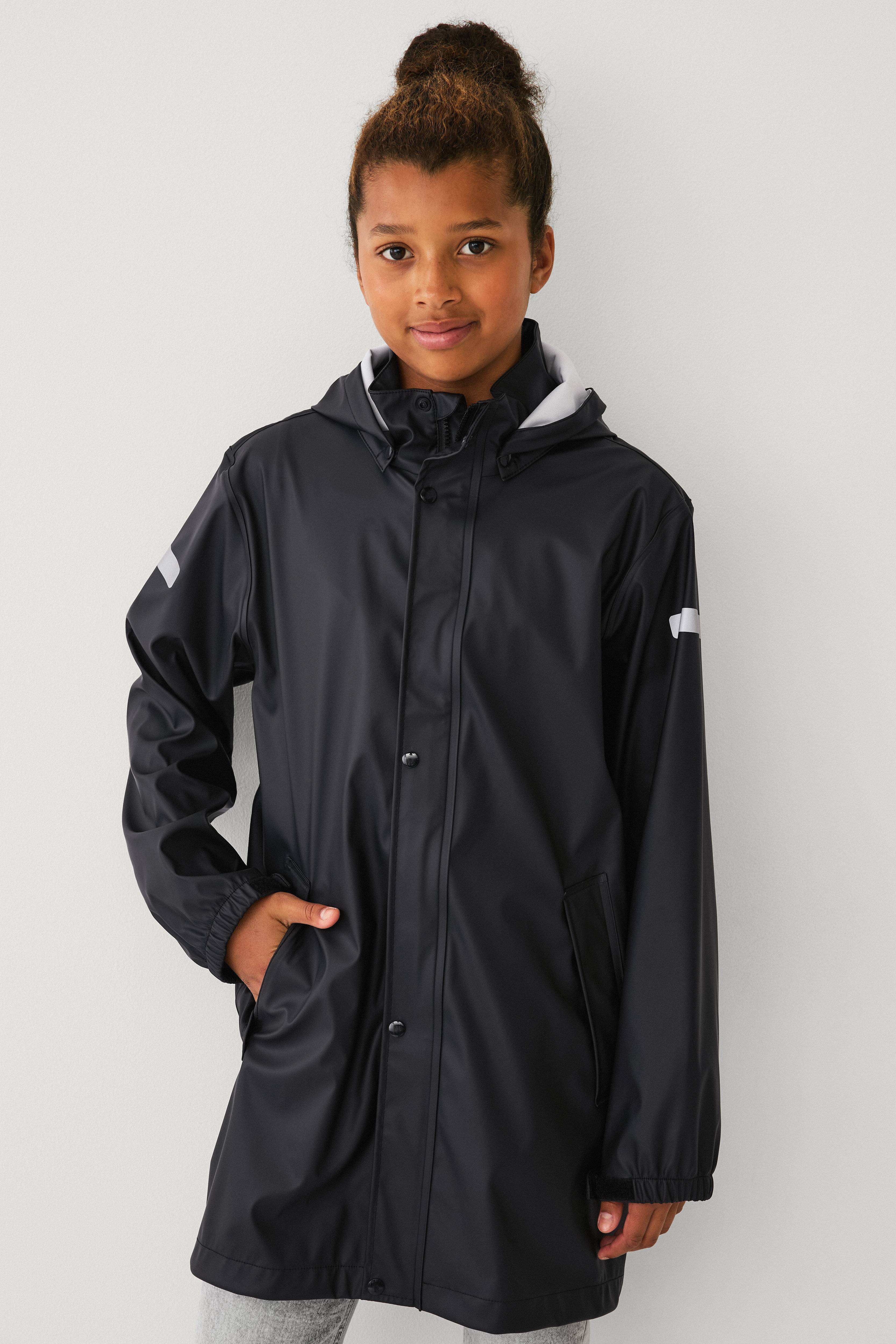 • Vandtæt, uforet regnjakke• Aftagelig hætte med elastik omkring hættekanten• Høj krave med hagebeskytter• Lynlås med vindflap og trykknapper• Indlagte sidelommer• Elastik med velcrobånd ved ærmeafslutningerne• Refleksdetaljer på jakken