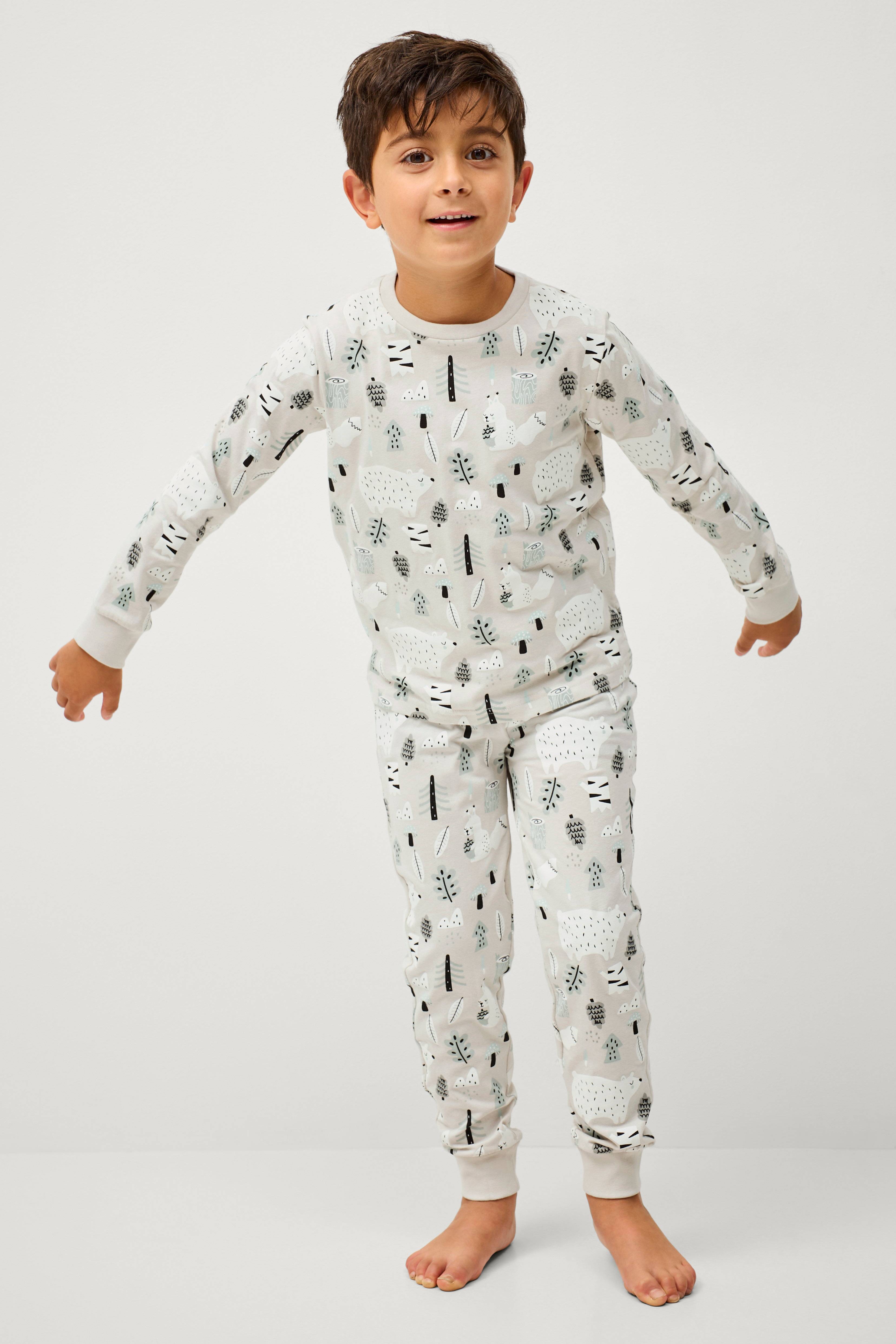 • Sæt• Langærmet top med rund hals og manchet ved manchetterne• Bukser med blød elastik ved taljen og manchet ved enden af benene