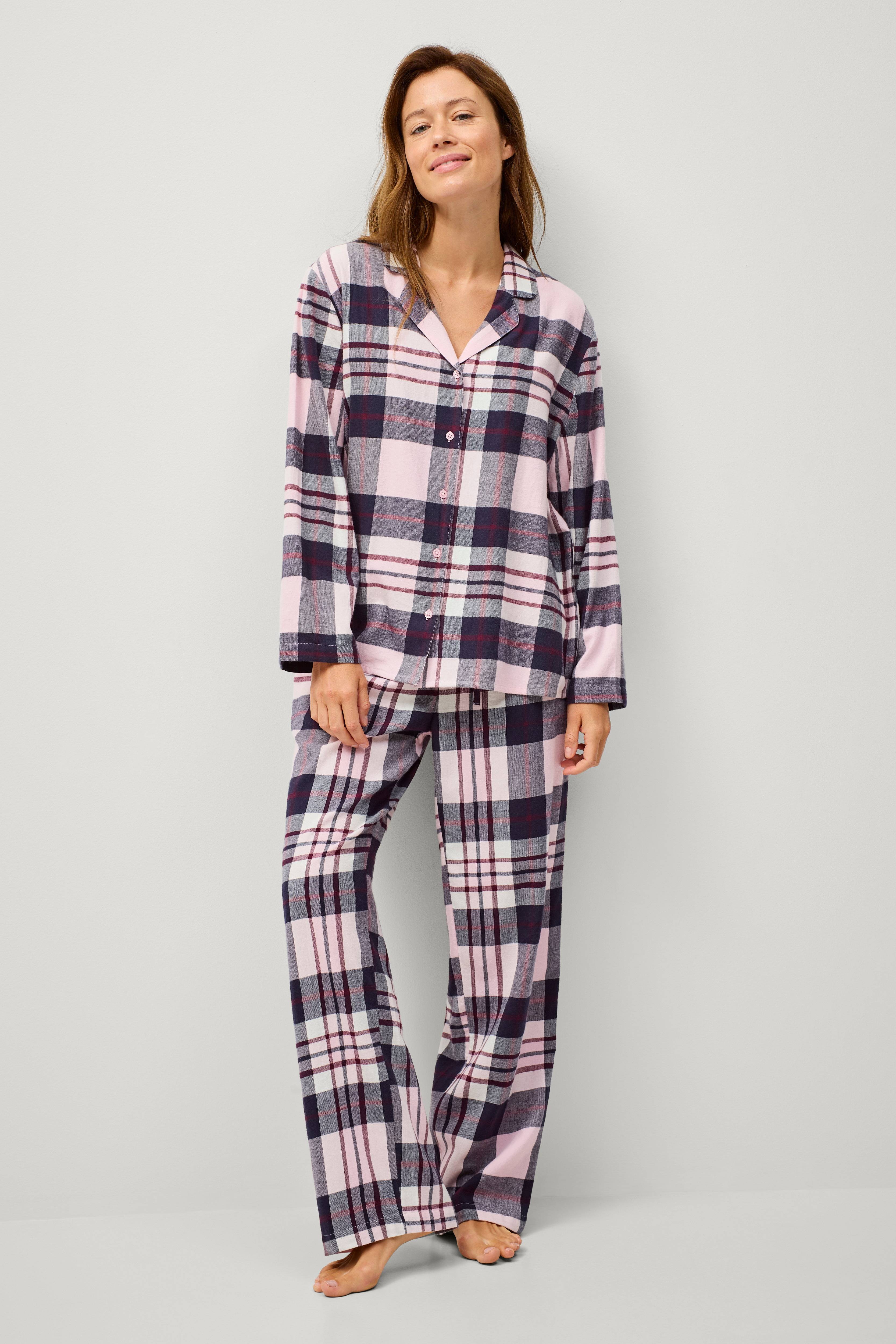 • Fremstillet af blød bomuldsflannel• Langærmet skjorte med krave og revers• Knapper• Bukser med elastisk talje og træksnørre• Sidelommer