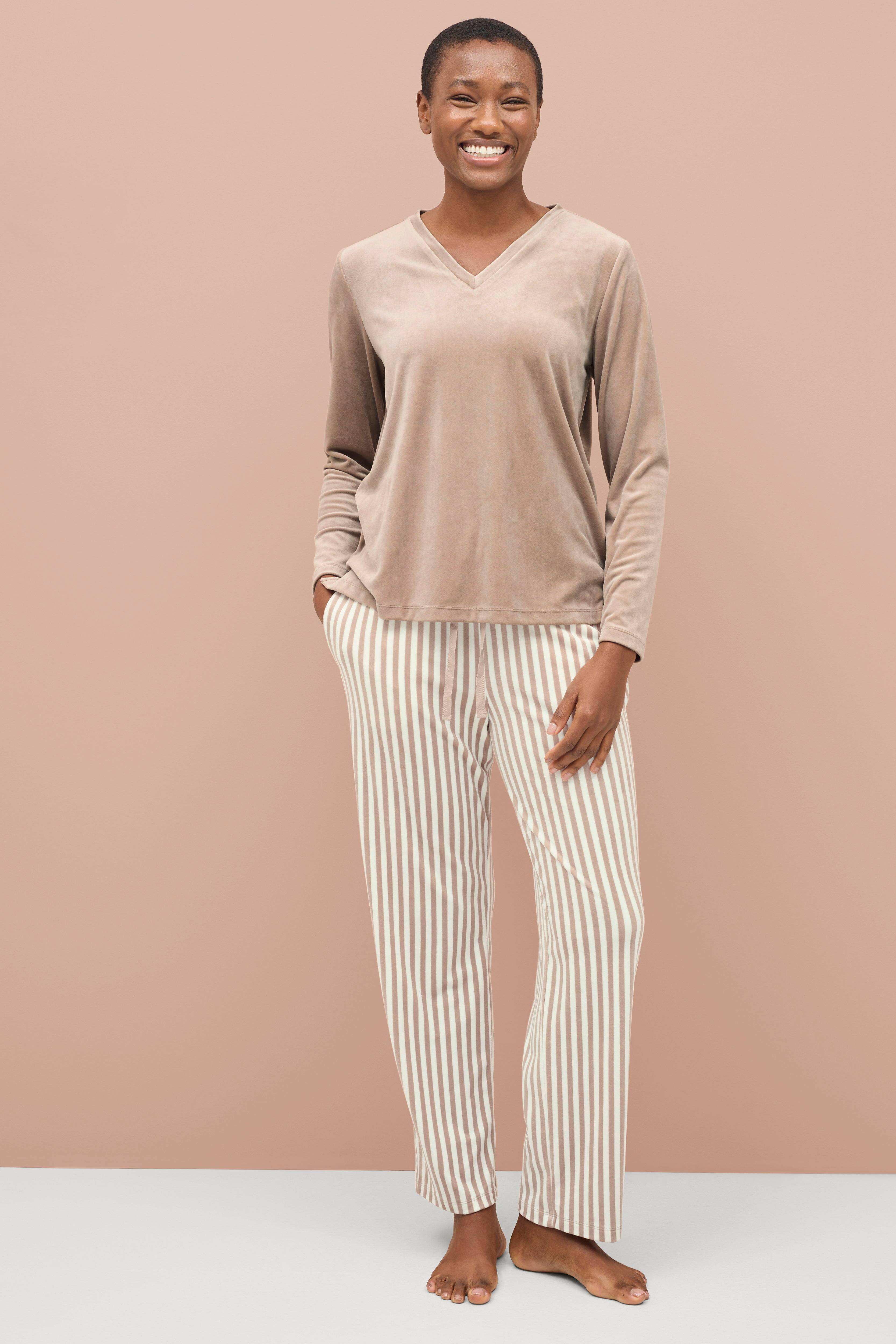 • Todelt sæt i blød velour• Langærmet trøje med v-udskæring• Bukser med træksnørre ved taljen og lommer i siderne• Løs pasform
