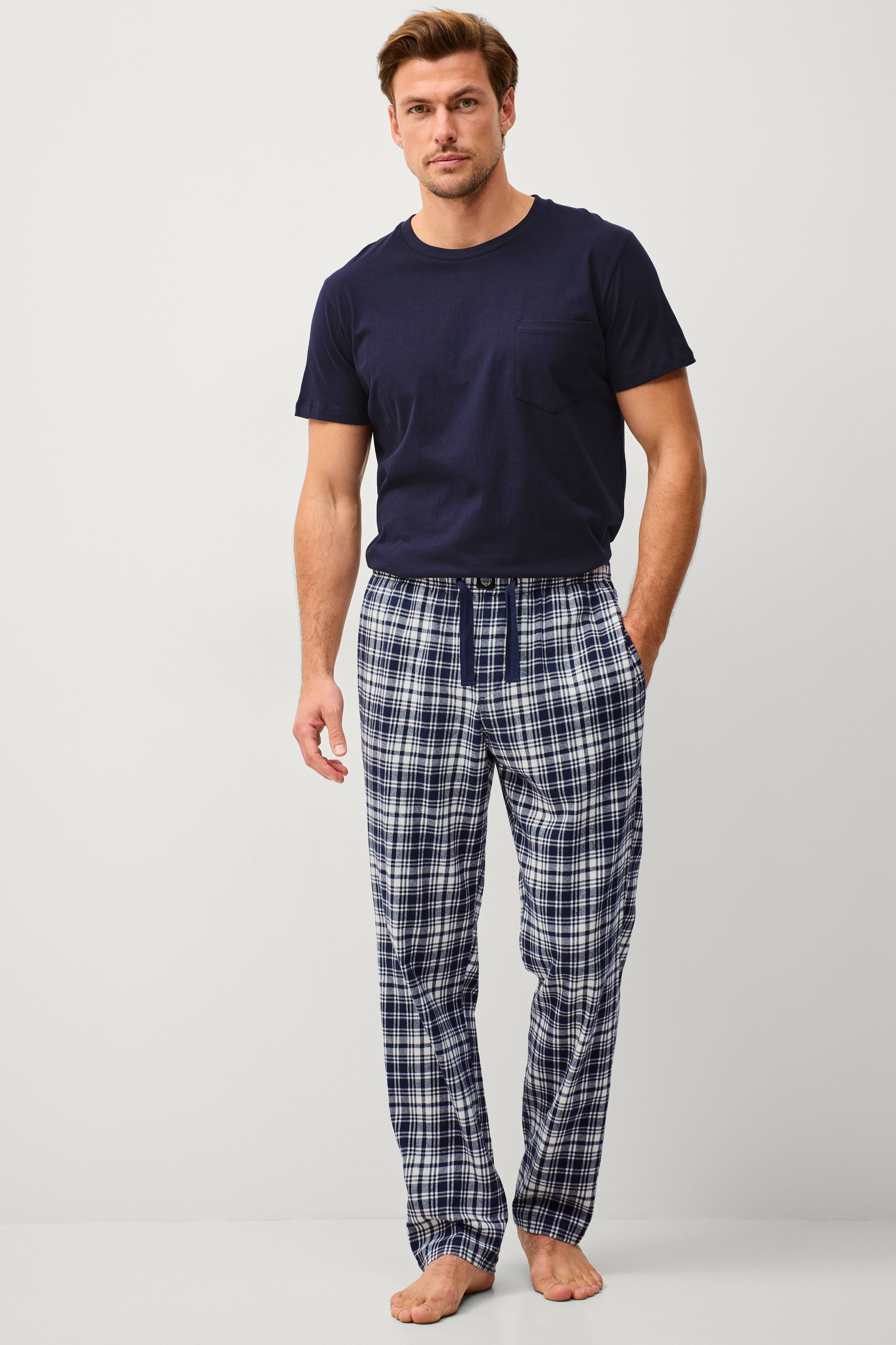 • T-shirt med kort ærme• Rund hals• Brystlomme• Flannelsbukser med lige ben• Linning med elastik og træksnørre• Sidelommer