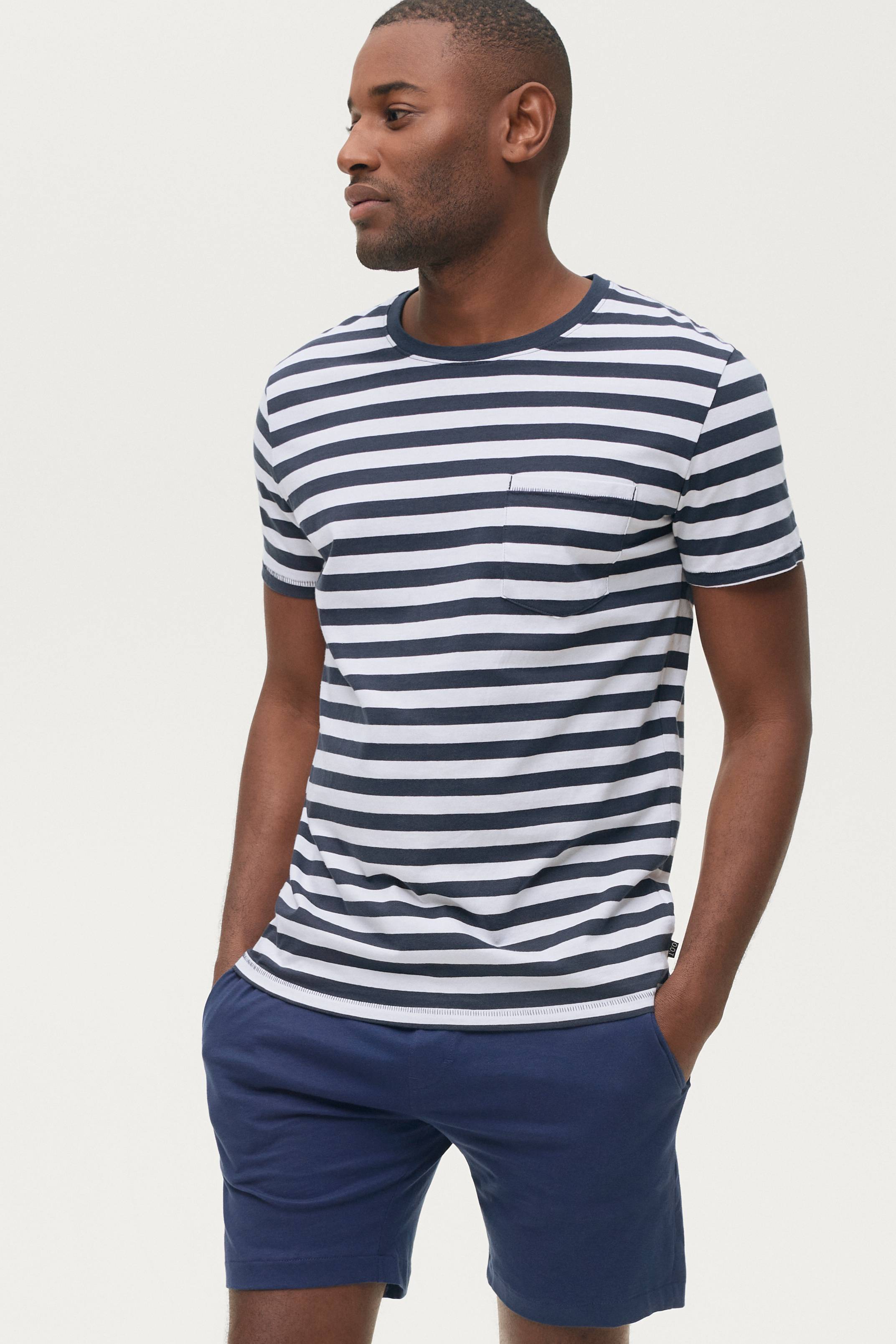 Pyjamassæt fra On Our Terms i bomuldsjersey. Kortærmet, stribet t-shirt med rund hals med rib og en påsyet brystlomme. Shorts med elastisk linning med løbegang samt to lommer.