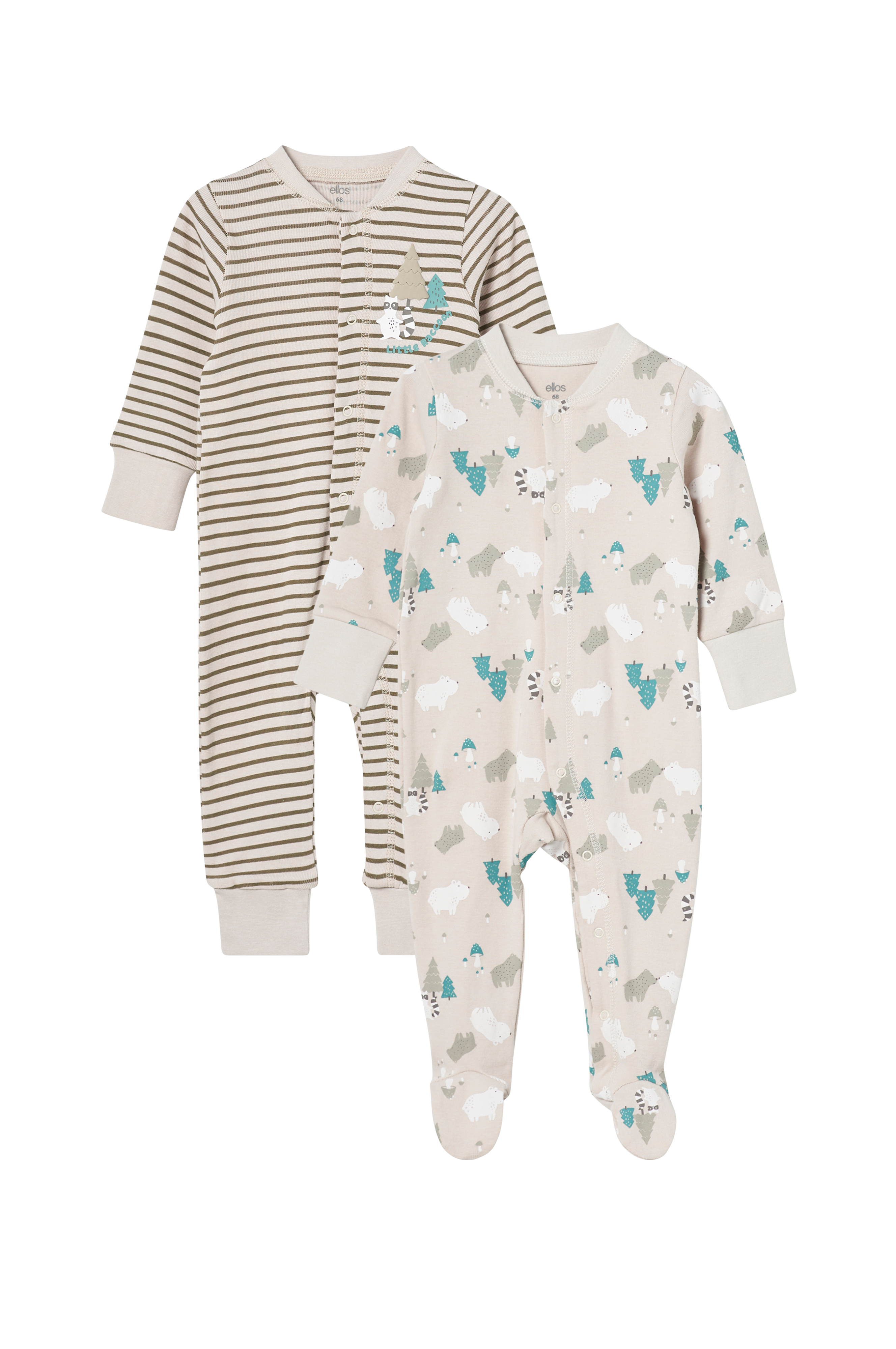 • 2 pyjamasovertræk i blød, økologisk bomuld. Det ene har en hel fod, det andet har ribkanter ved anklerne.