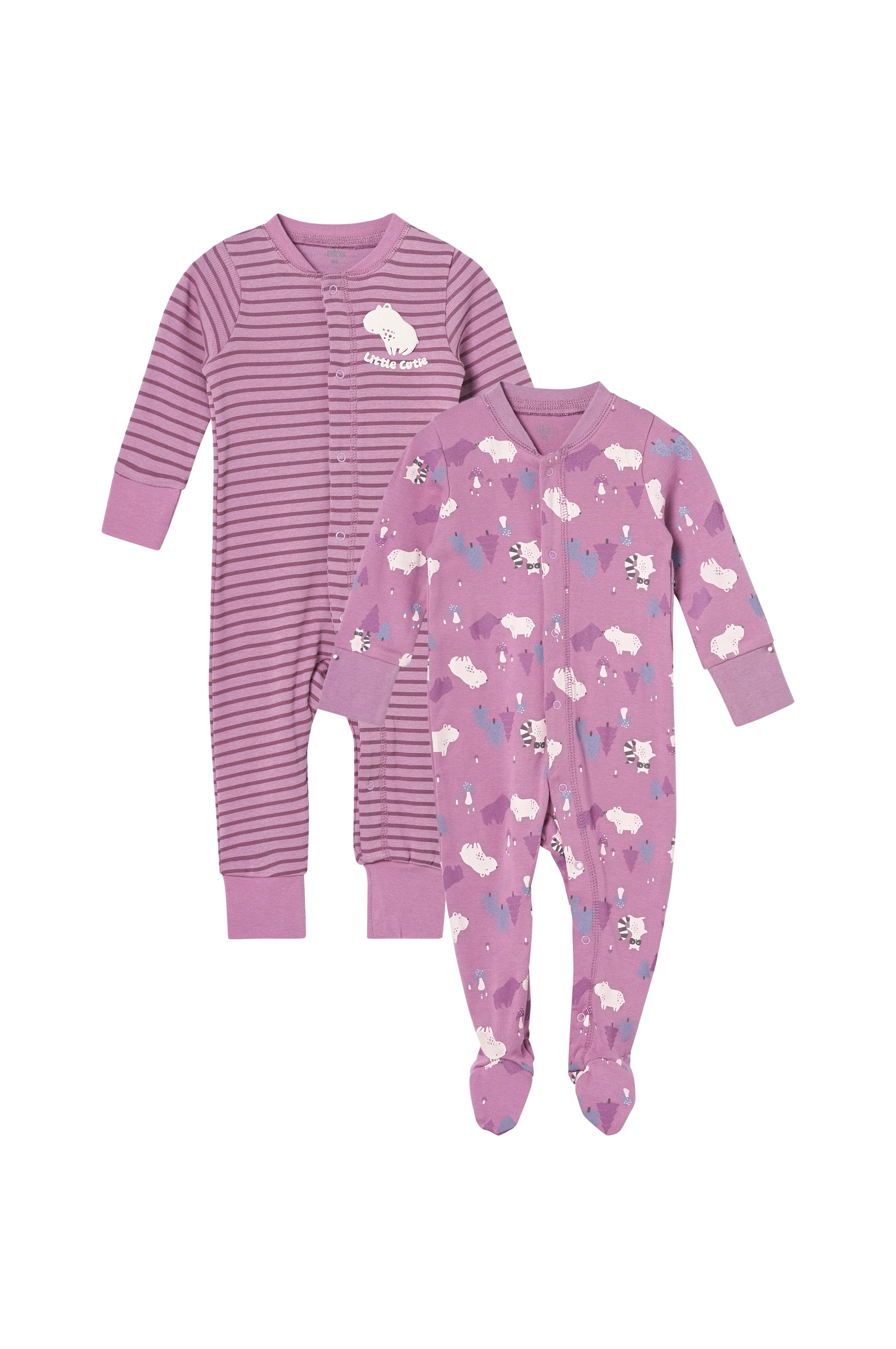 • 2 pyjamasovertræk i blød, økologisk bomuld. Det ene har en hel fod, det andet har ribkanter ved anklerne. • Trykknapper foran • Produktet indeholder økologisk bomuld, som er dyrket uden kemiske sprøjtemidler, kunstgødning og genmodificerede afgrøder (GMO). Dette betyder et sundere arbejdsmiljø for landmænd og bedre jord.