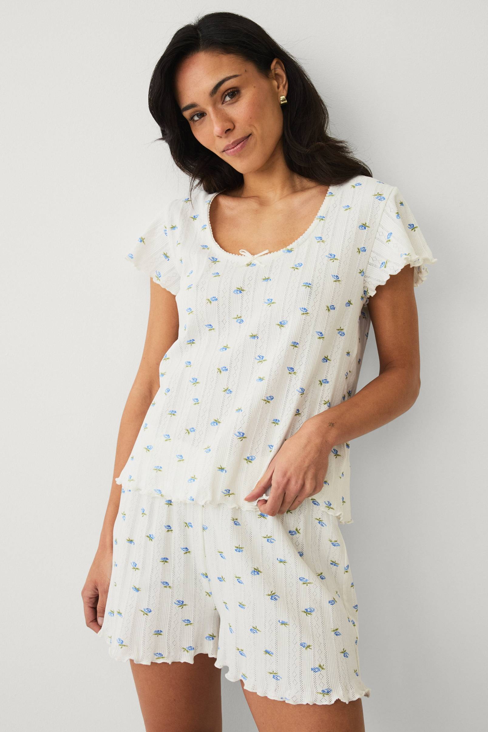 • 2-delt pyjamas i pointelle med bølgede kanter• Kortærmet top• Rund halsudskæring med smal blondekant og dekorativ sløjfe• Shorts med høj, elastisk talje og lille, påsyet sløjfe