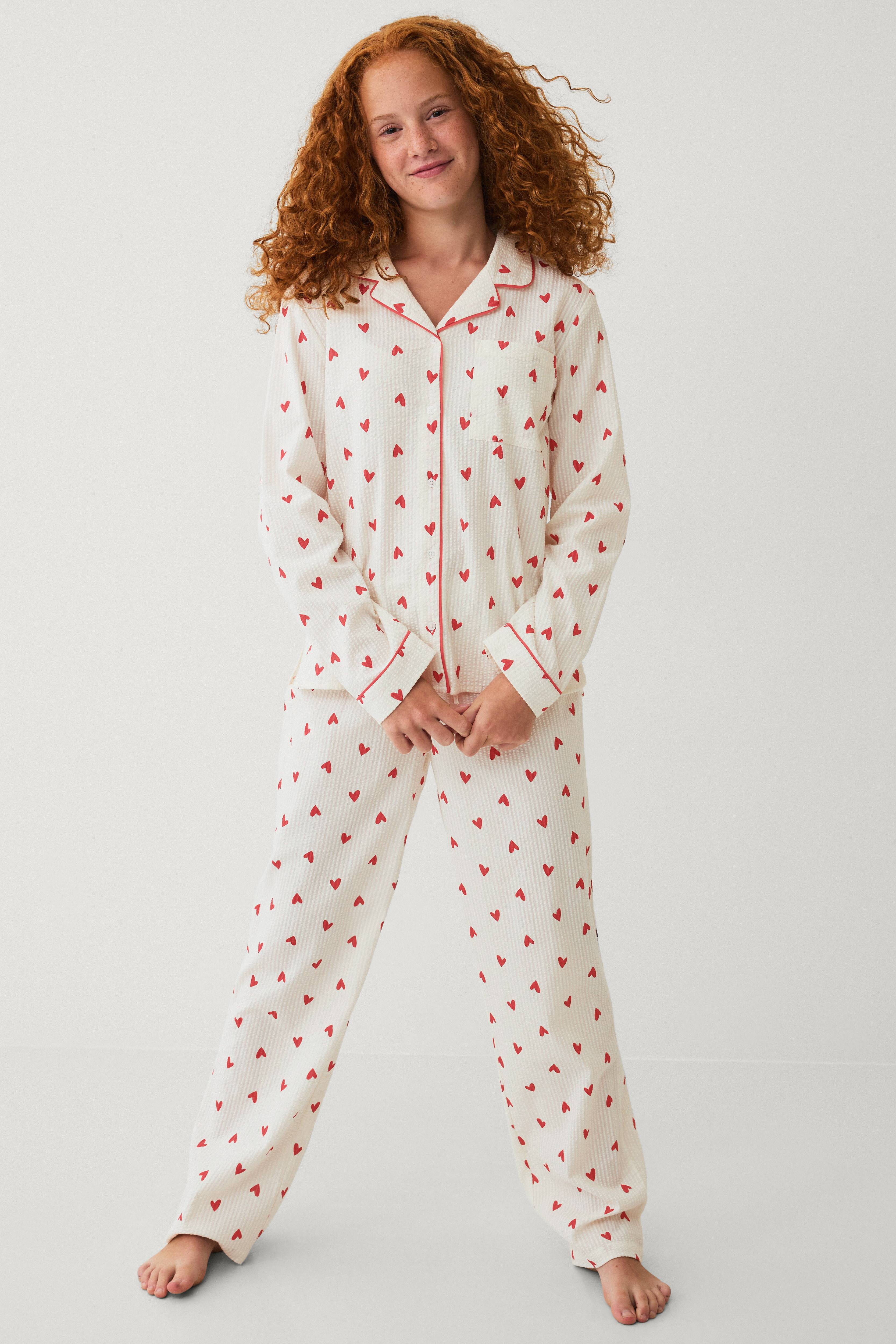• Pyjamassæt i Seersucker-stof med boblet struktur• Printede hjerter hele vejen rundt• Langærmet skjorte med v-udskæring og brystlomme• Knapper foran• Slids nede i siderne• Bukser med elastik ved taljen