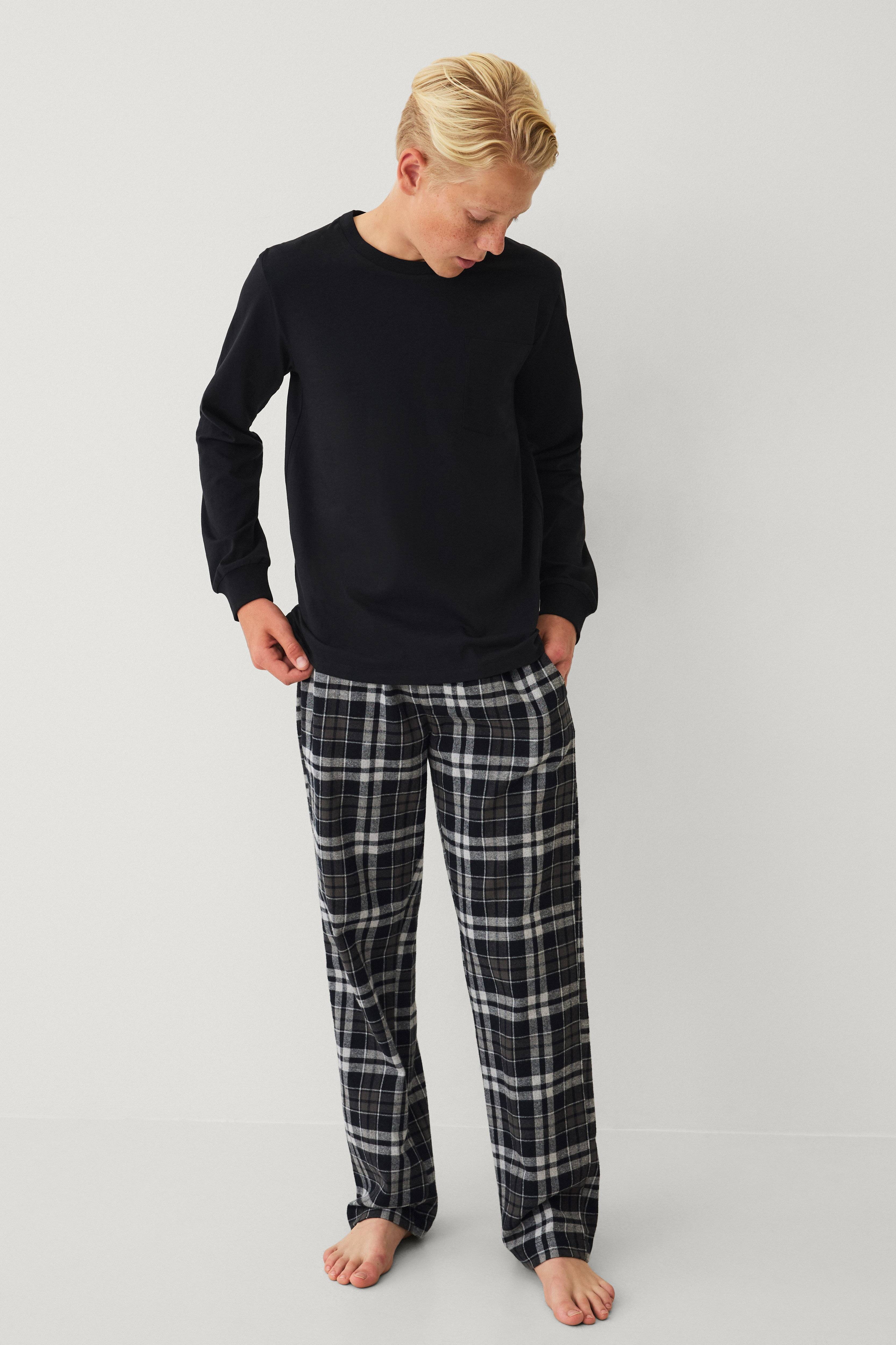 • 2-delt pyjamas i bomuld• Langærmet t-shirt med brystlomme• Rund, ribbet halsudskæring• Ribmanchetter ved manchetterne• Bukser i flonel med sidelommer• Elastisk talje med træksnørre