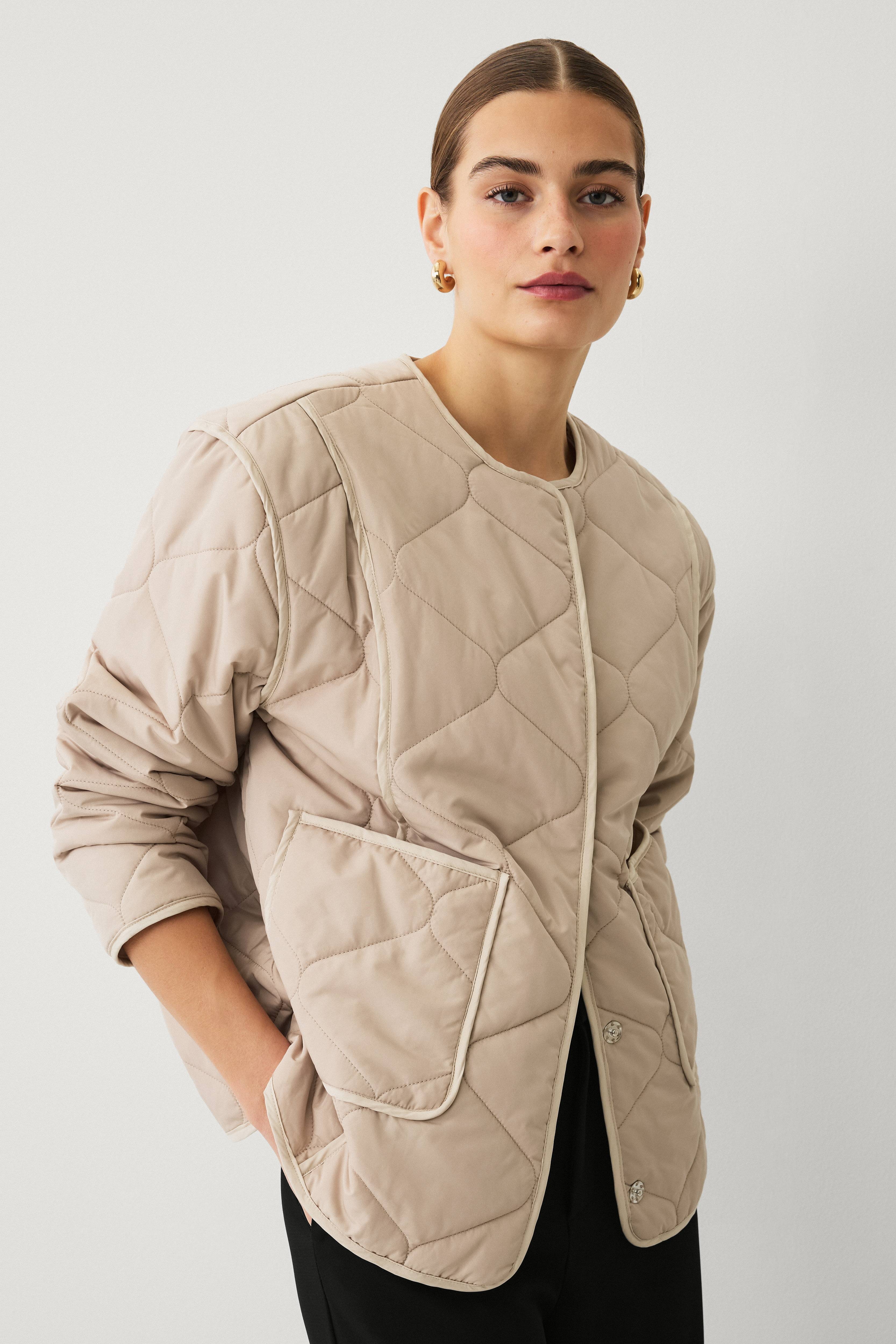 • Quiltet, let foret jakke• Oversize model• Rund halsudskæring• Lukning foran med skjulte trykknapper• To åbne forlommer• Dekorative sømme foran• Foret• Længde: 70 cm i størrelse S