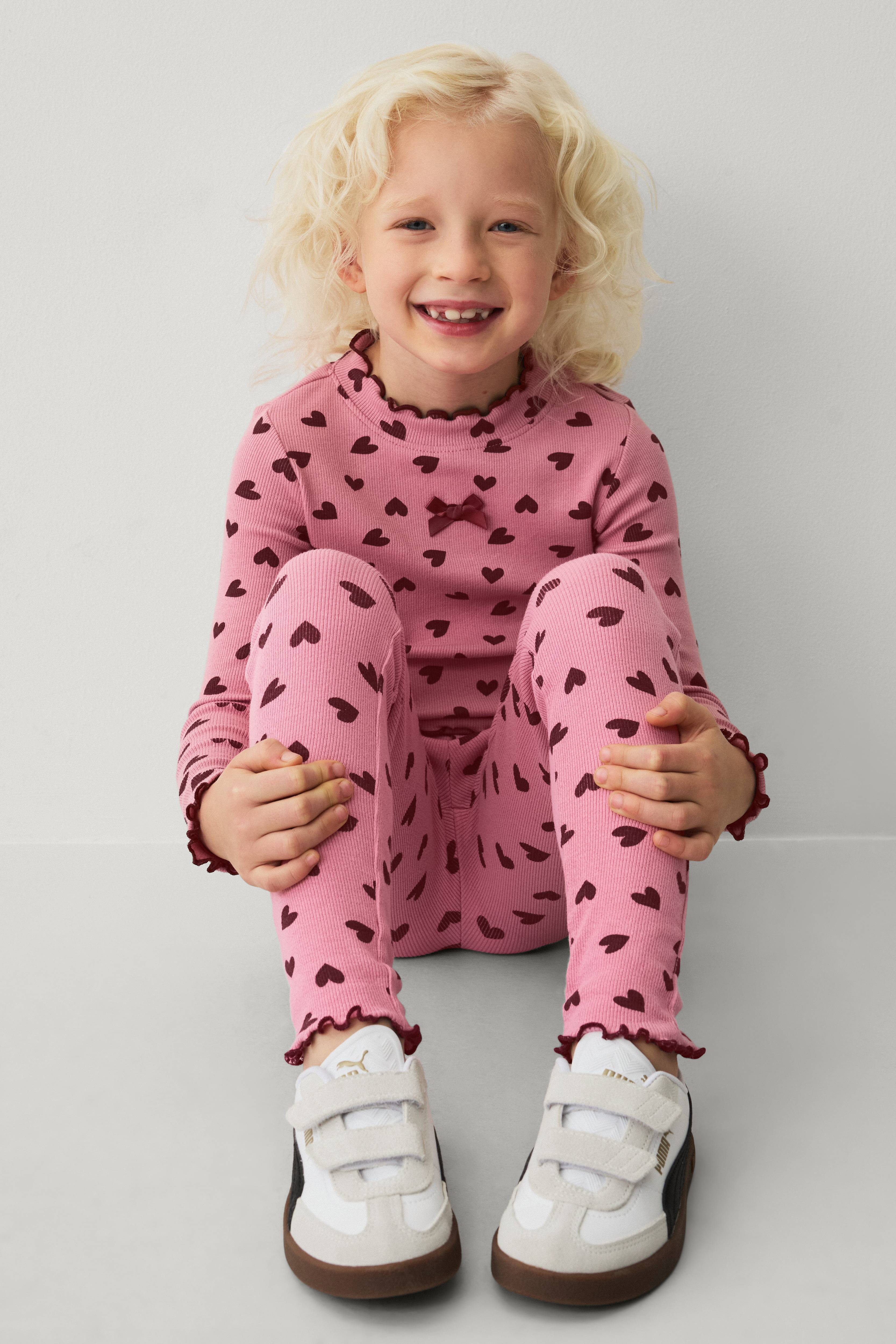 • Ribbede leggings i bomuld med printede hjerter• Elastisk talje• Bølgede kanter ved enden af benene