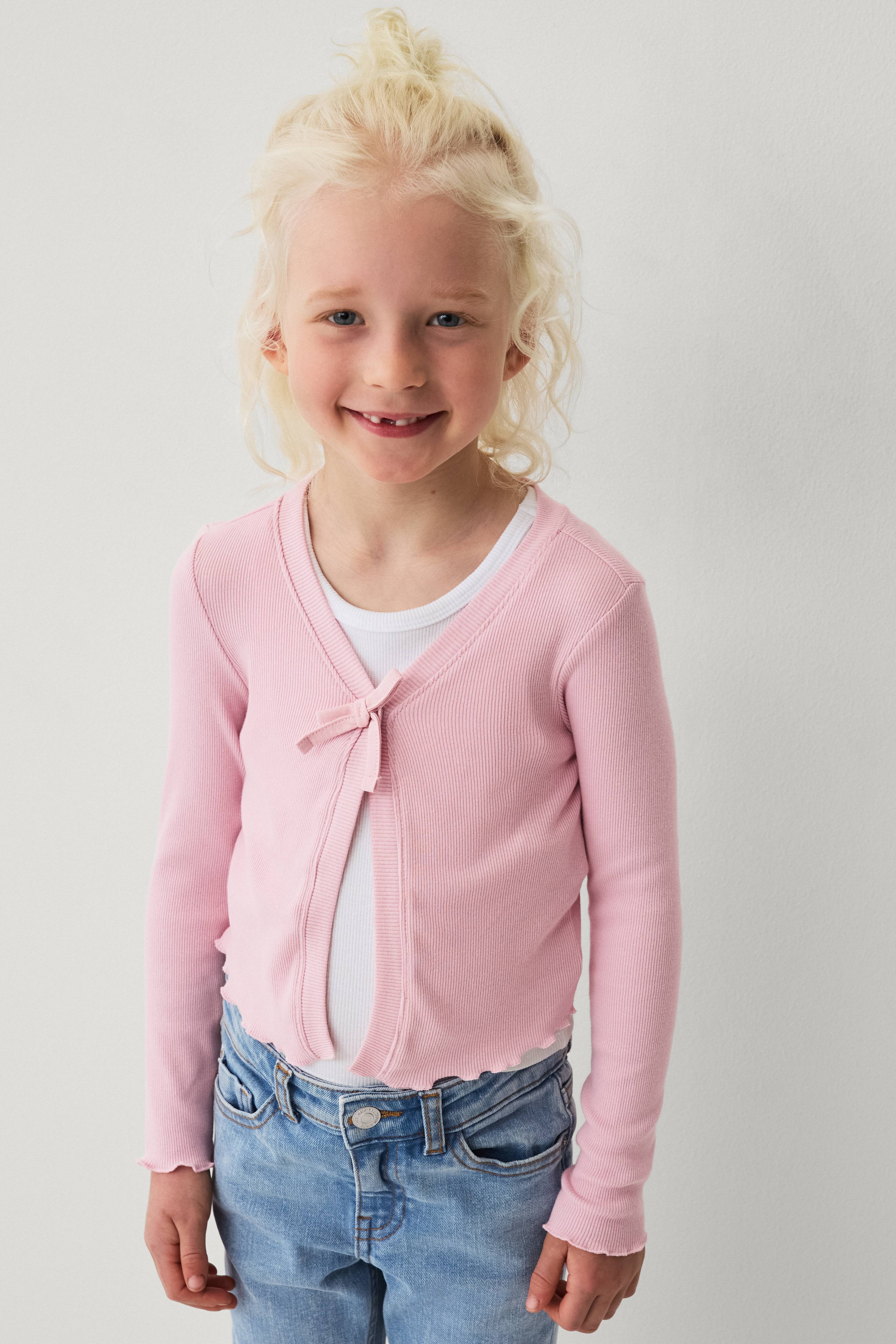 • Cardigan i ribbet, elastisk jersey• V-udskæring• Lukning med en skjult trykknap på toppen• Påsyet bånd oppe foran• Bølgede kanter ved manchetterne og nederst