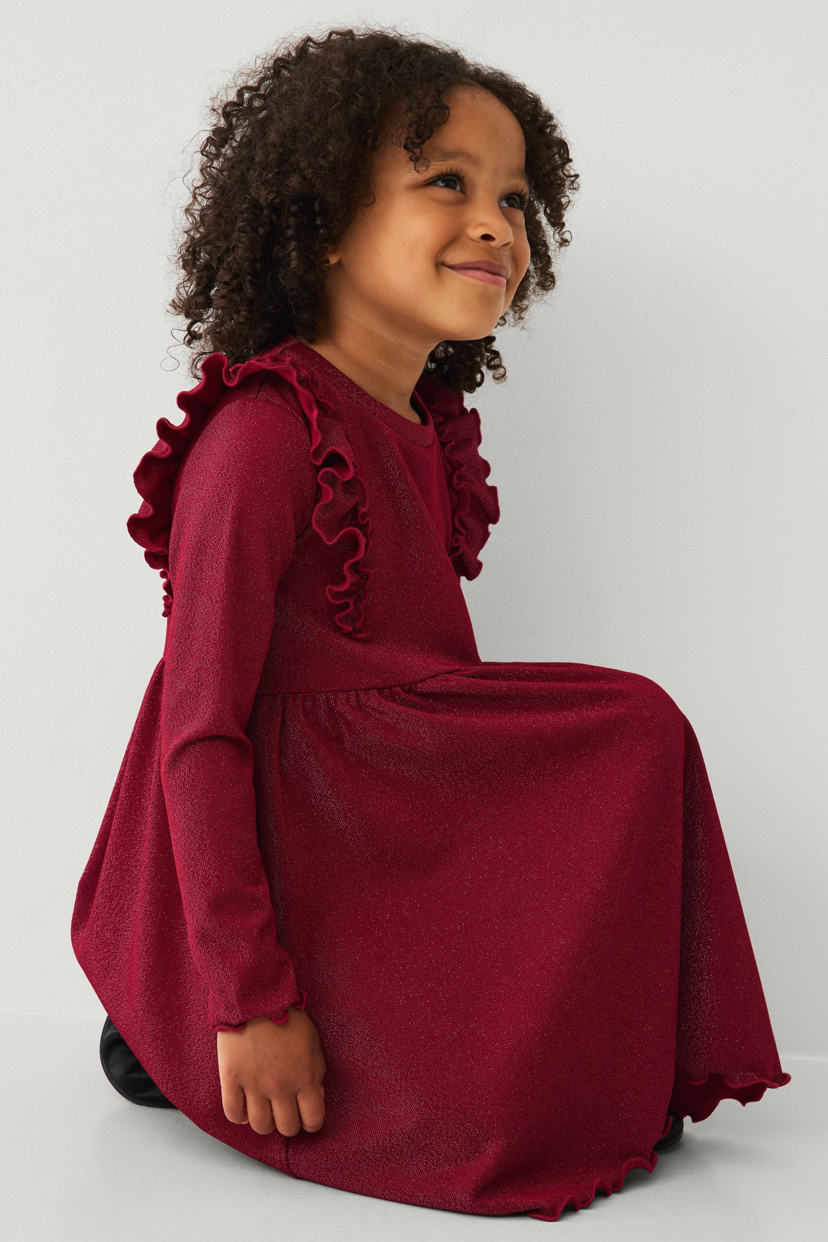 • Langærmet, elastisk kjole med glitrende, ribbet materiale• Rund, ribbet halsudskæring• Påsyede volanter over skuldrene• Samling ved taljen• Bølgede kanter ved manchetterne og nederst