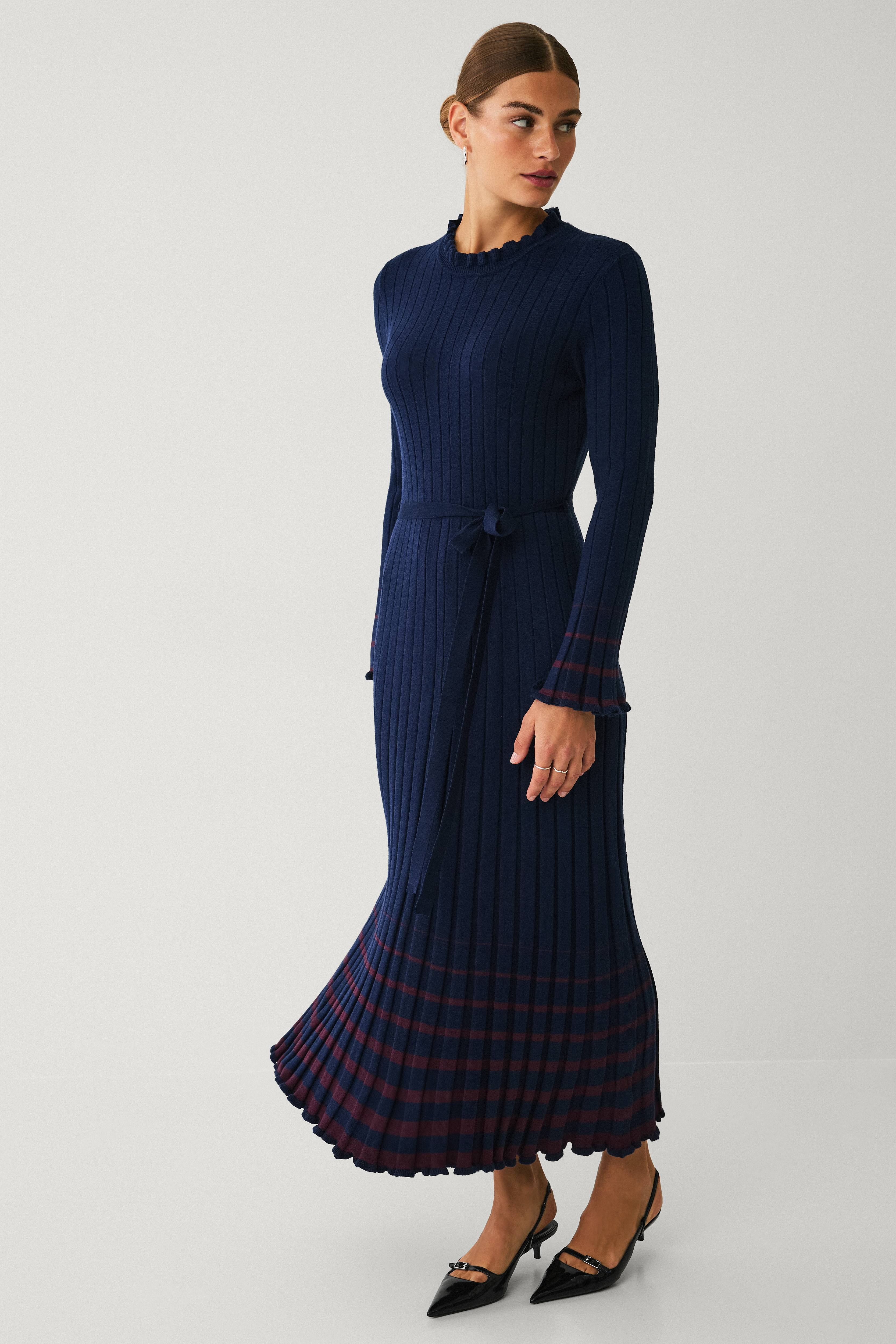 • Strikket maxi kjole i viskoseblanding med ribbet struktur • Rund halsudskæring • Aftageligt bindebælte ved taljen • Lange ærmer med brede ender • Længde: 138 cm i størrelse 40